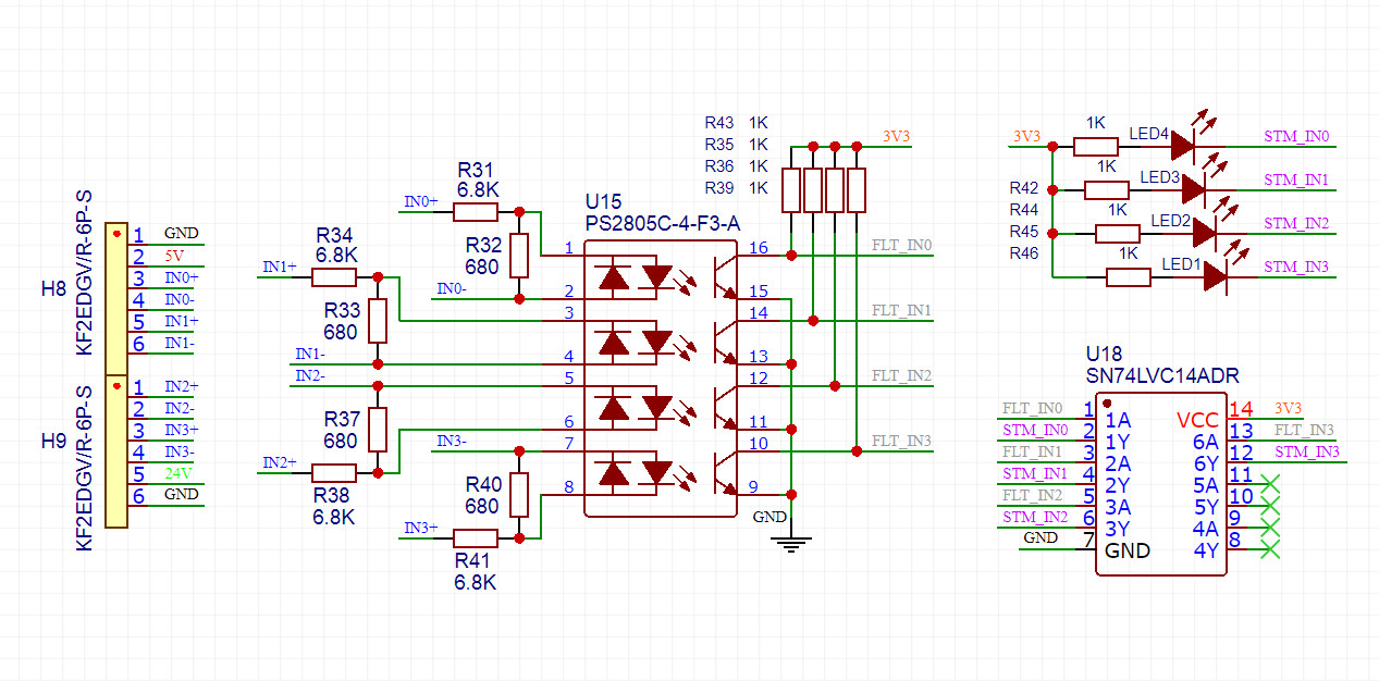 Ну и номиналы входных резисторов тоже как бы "отфонарные". Если от 24 вольт еще может будет как-то работать (какой у этого оптрона номинальный ток?), то от 5 - гарантированно нет.