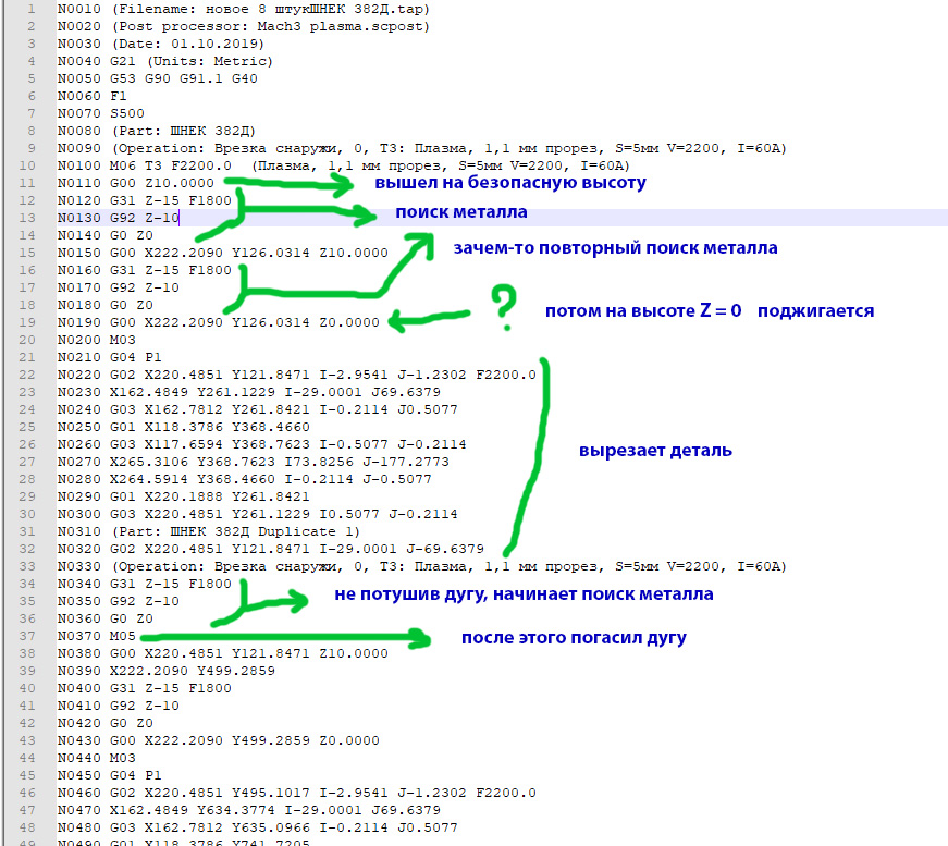 Как происходит рез: плазмотрон опускается до касания, поднимается на безопасную высоту, делает рез и в конце реза приходит в нулевую точку (замыкает контур реза), и плазма не выключается, со включенной горелкой ось Z опускается вниз касаясь металла и потом опускается еще где-то на 10мм, потом поднимается со включенной горелкой и когда горелка уже высоко от металла - отключается. А следующую деталь начинает прорезать не касаясь металла и все то же самое повторяется, и с каждой следующей деталью, плазмотрон все выше и выше от металла, ну и потом соответственно пропадает пламя, т.к. плазмотрон находится высоко над металлом. В чем может быть ошибка?