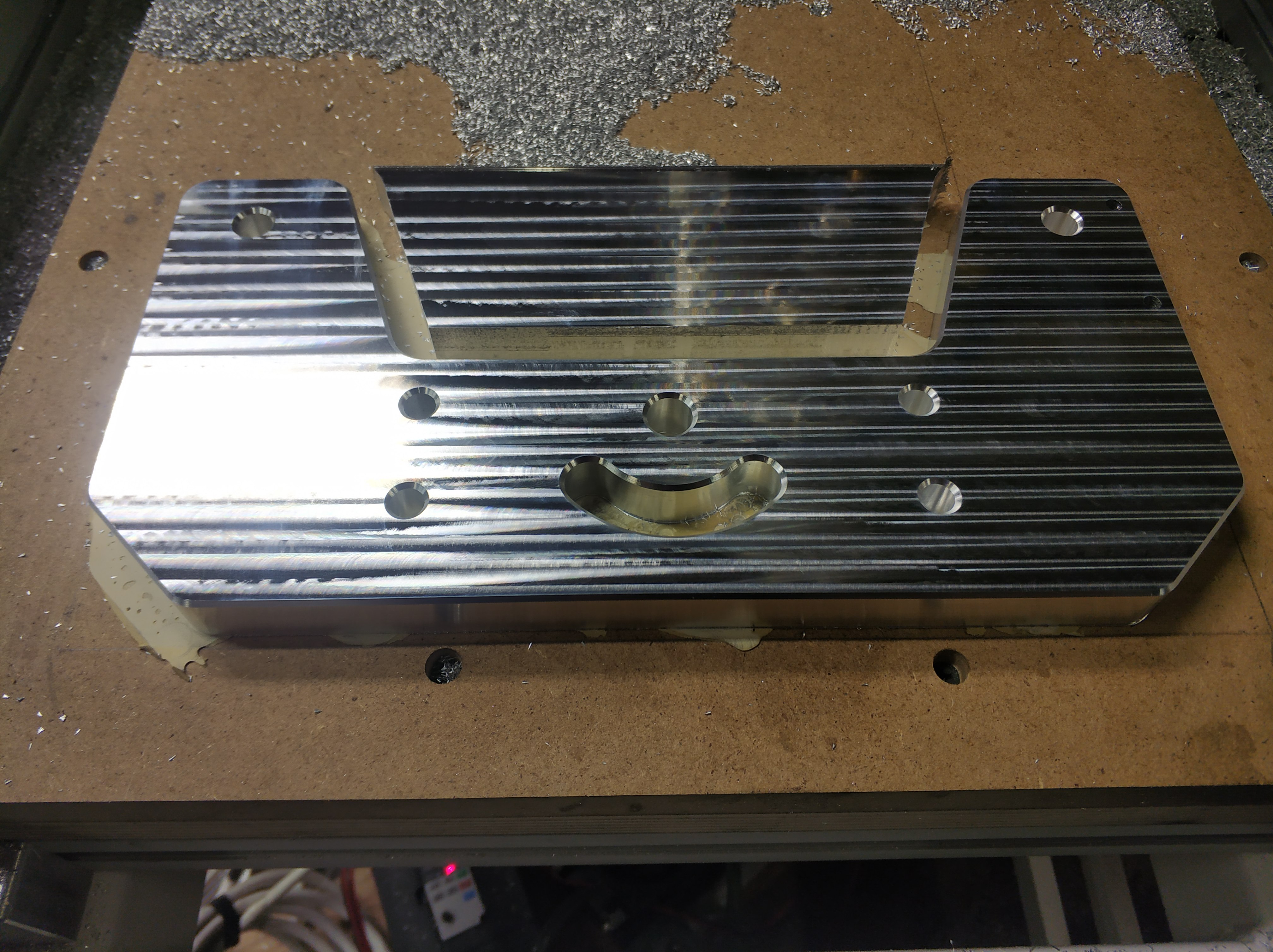 Станок переехал на рабочее место, и сегодня был первый запуск. Панелька с отверстиями из 3мм д16т, фреза десятка, 12к оборотов, подача 2,4м