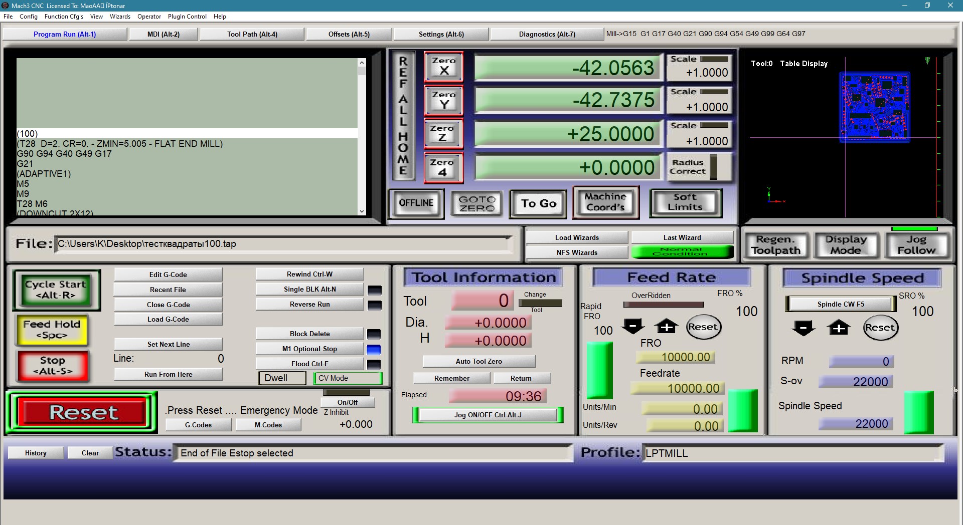 Далее при абсолютно идентичных настройках мача запустил параллельно эту уп, и через час посмотрел что там происходит - мач бы процентов на 25 впереди по строкам. Опять же, может там просто скорость по другому считается, и фид рейт чуть подкруть можно на те-же 25% и всё будет ок, но и есть уже примеры, когда всякие европейские контроллеры на тяжелых УП работаю с тормозами и дерганьем, что сильно сказывается на качестве. Мач конечно тоже немного тормозит, и при таком же тупом сравнении, например NC студия его обгоняет, и она вроде как код пережевывает быстрее и плавнее.