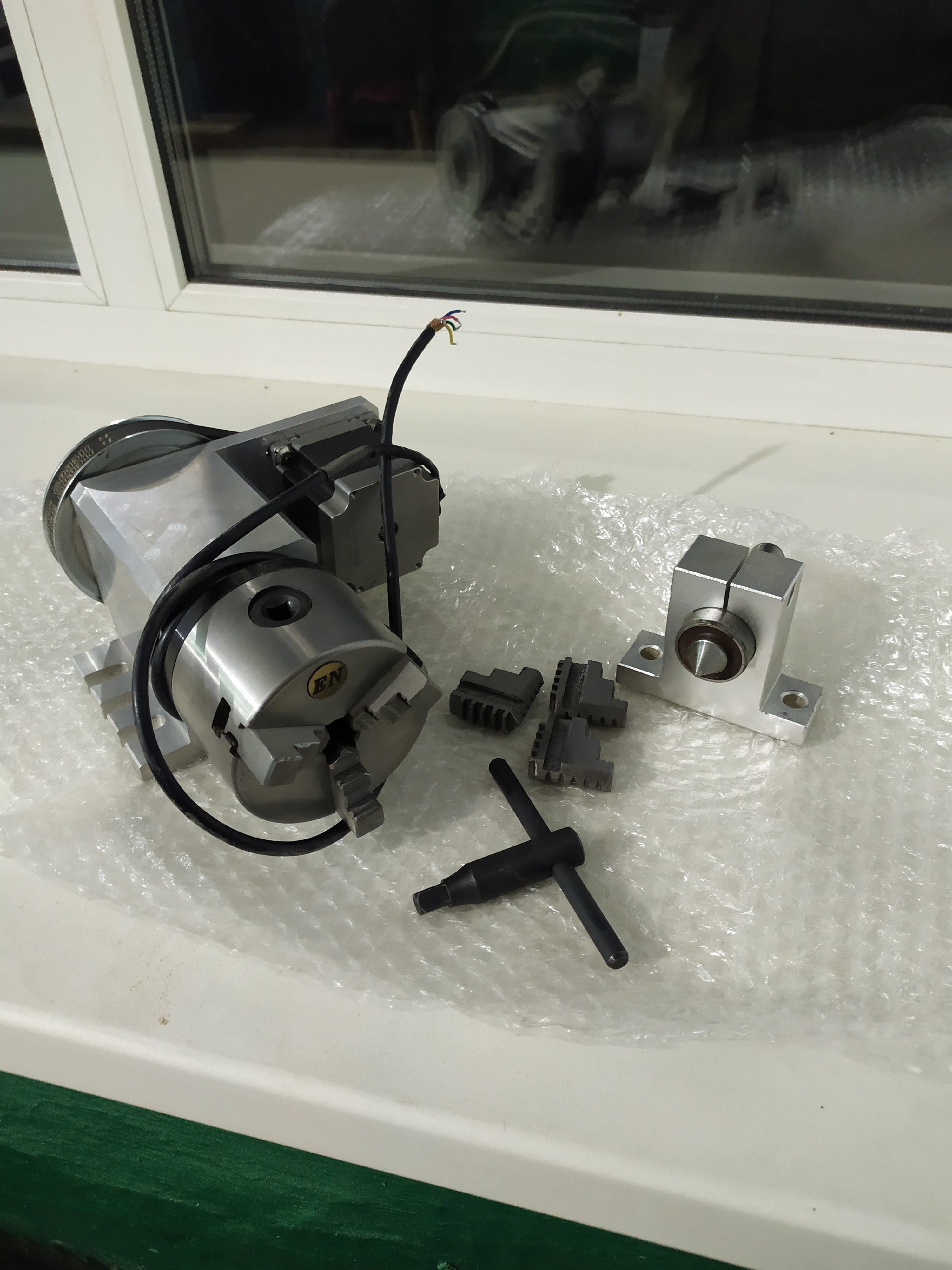 Поворотная ось на ременном редукторе. Передаточное 90:16 либо 90:15 Мотор Nema23 12кг. Патрон 3-х кулачковый d 80мм, комплект прямых и обратных кулачков. Высота до оси вращения 55мм. Задний упор в комплекте (высота центра 42мм). Возможна комплектация драйвером tb6600 +500р