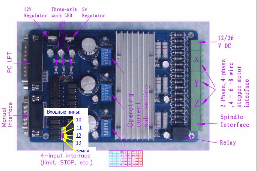 Пины LPT порта 10,11,12,13,15 - входы. Когда мы соединяем один из этих пинов с массой, система видит входящий сигнал. Ниже распиновка входов на синей плате.