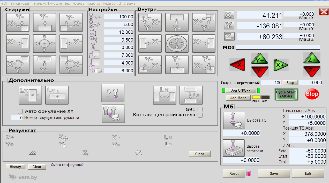 Safe всегда выше или равно Start. У Вас наоборот.dumpdr писал(а):Дальше попробовал после этих экспериментов (после сброса) нажать кнопку высота TS . Предварительно задал значение Safe -20 , Start -5 и Dist -5( с минусом т.к. писал у меня ноль вверху а внизу у стола -100) , а так же координаты XY где стоит датчик .Ось Z поднялась до высоты в -20 и остановилась. Дальше ни чего не происходило. Не было последующего перемещения в координаты где стоит датчик инструмента.