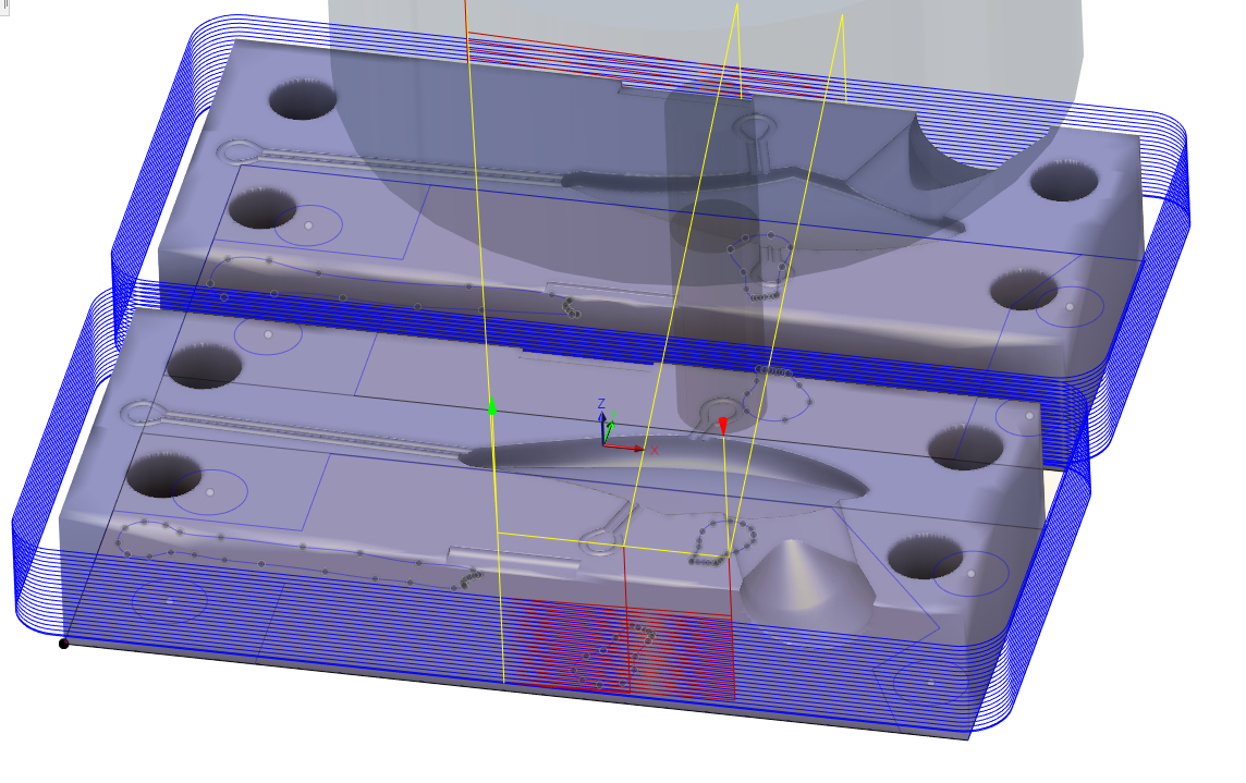 Вот такие настройки и такая траектория. Да еще и фреза лишние шаги делает, надо где то указать, что сначала фрезеруем одну деталь полностью, потом вторую.