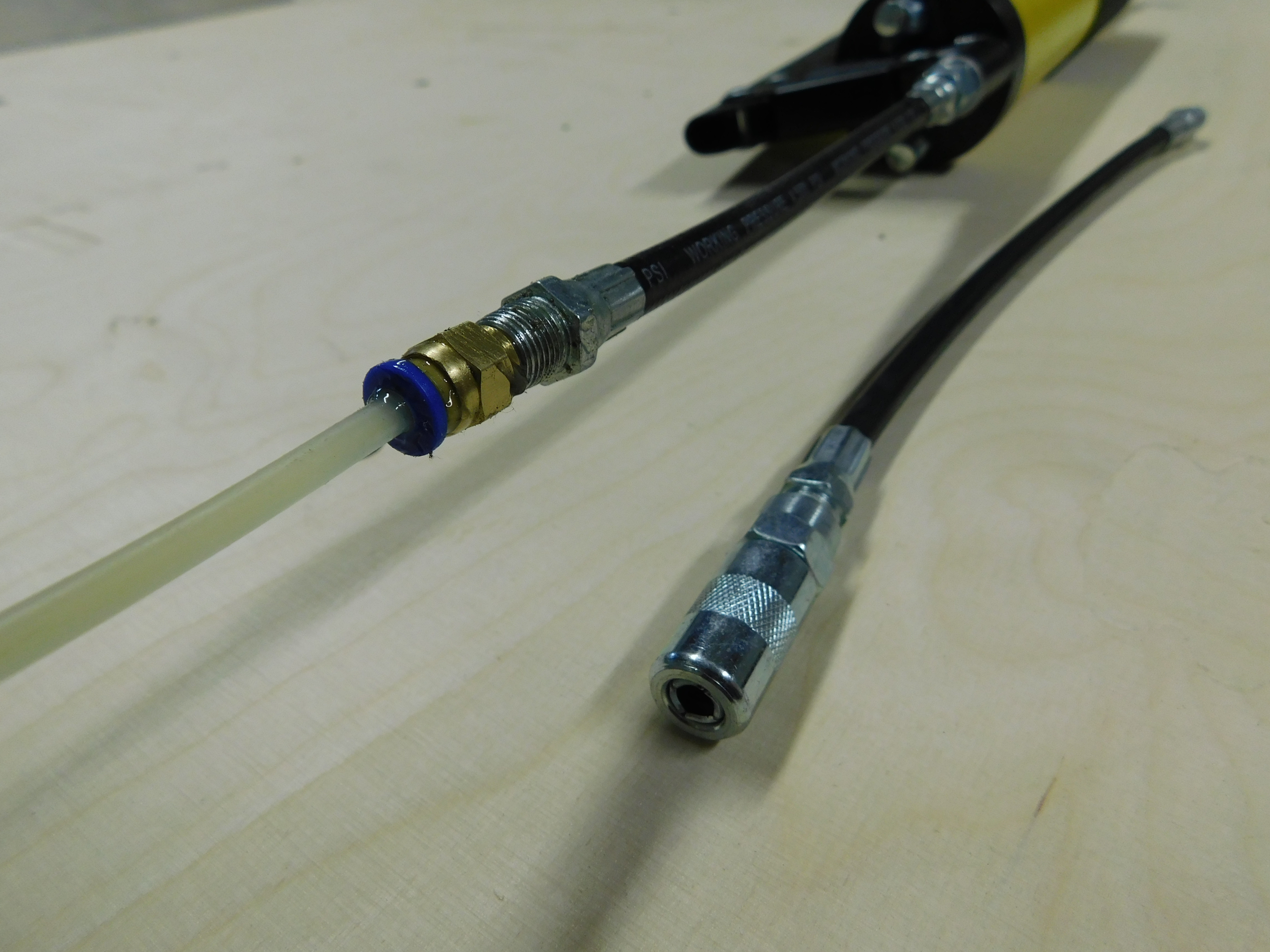 Немного доработал конструктив шприца, чтобы отказаться от лепесткового зажима(из него смазка повсюду лезет). Единственное, что пока не совсем хорошо: смазка доходит до узлов с непостоянной скоростью. Но это, я думаю решаемо, если установить коллектор с регулировкой расходов. Да и к тому же к каждому узлу (их 4шт) сейчас подходит трубка от центрального коллектора, можно её отсоединить и шприцевать прямо туда. Вводы в каретки пришлось делать самодельные,тк с резьбой М4 и с наклоном 90гр не нашлось.