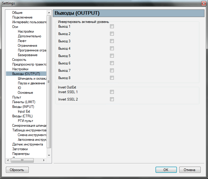 Я использую выход 1 для вкл/выкл шпинделя (команды Г кода соответственно М03/М05), выход 2 для охлаждения (М08/М09), 3 выход можно для вкл. тумана (М07). По аналогии можно и другими выходами управлять, надо только в описаниях Г кодов найти управляющие М команды.