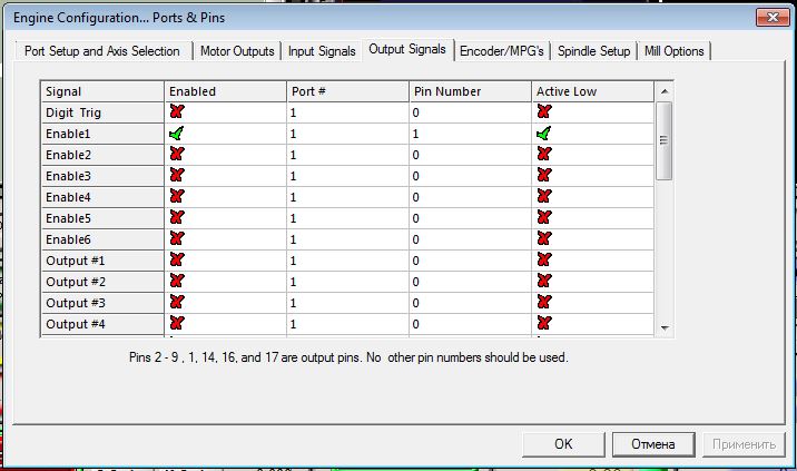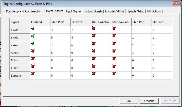 Выложу скриншоты настроек MACH3 (пины осей брал из инструкции к плате, концевики пока не подключал). Это все что я менял: