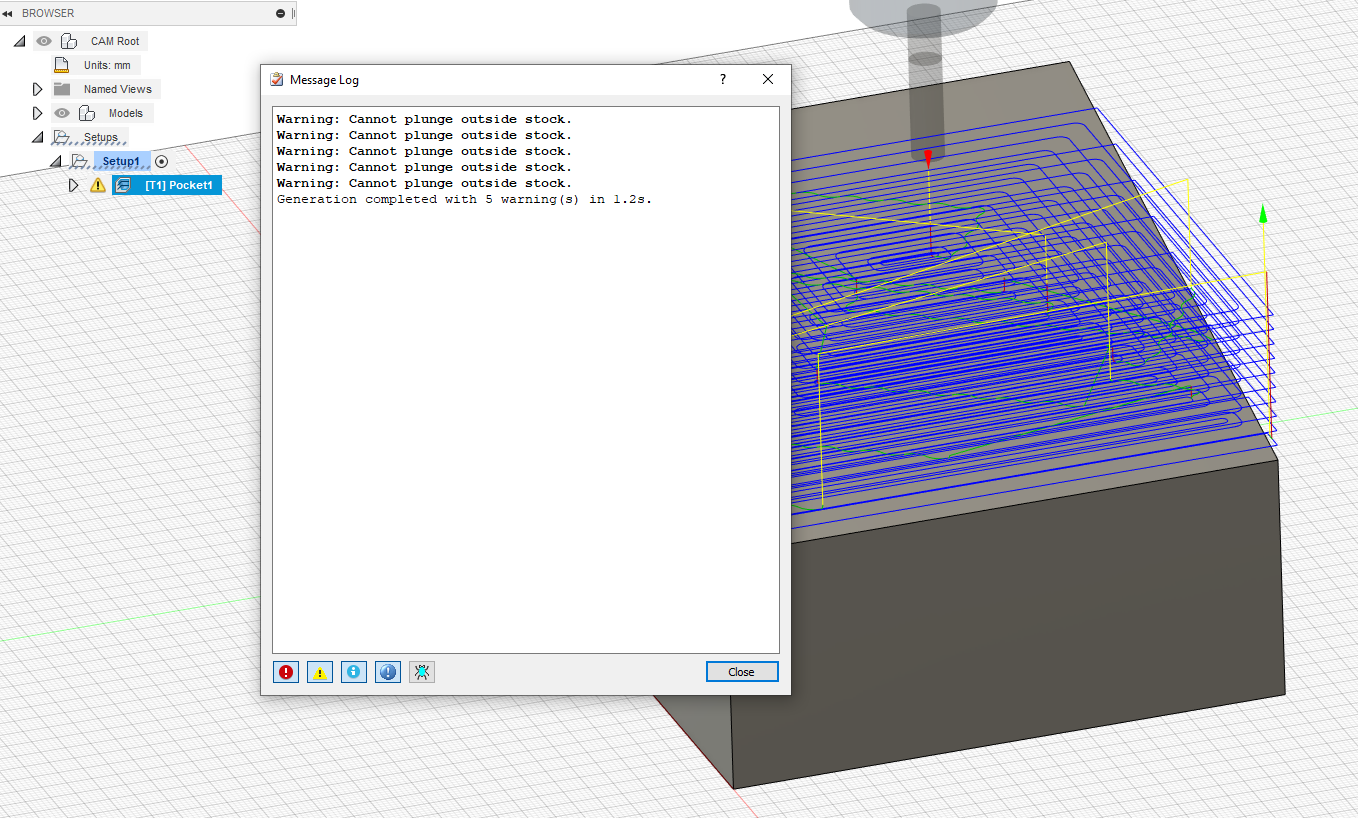 После последнего обновления 2.0.6658 выдает предупреждение Warning: Cannot plunge outside stock для pocket clearing.