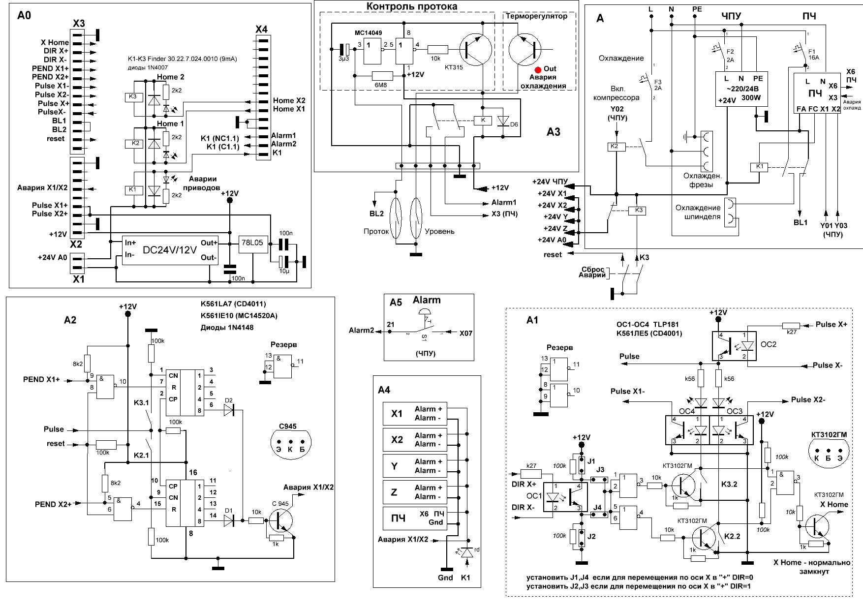 Разработанная плата не привязана к конкретному контроллеру. Ей все равно с кем работать. Блок А1 можно использовать отдельно - схема приведена ранее. Для нормального контроля перемещения нужны блоки А1 и А2. Задача этой связки не только правильная установка в домашнюю позицию двух двигателей на одной оси, но и контроль их работы. У меня был случай когда на одном драйвере были проблемы с питанием, а второй работал и перекашивал каретку, не выдавая Аварию по перегрузке. Для исключения этого и был сделан А2. Драйвер для моей схемы скорее всего так же можно использовать H86S, но у меня его нет и за его схему я не ручаюсь (в смысле соответствия переделки на JSD2505M.) Драйвер так же может быть и без обратной связи по энкодеру, но энкодер или датчик импульсов нужен обязательно. Сигналы Alarm у JSD2505M и H86S формируются при: токовой перегрузке и проблемах энкодера. Схема блока А4 объединяет все Alarm с драйверов где они есть JSD2505M/ПЧ/платы и через реле К1 (в А0) выводит их в цепь Аварийного отключения (E-Stop), если в нее перенести реле К1, то остальные блоки для ее работы не нужны. Блок А2 можно использовать отдельно, подав необходимые сигналы.