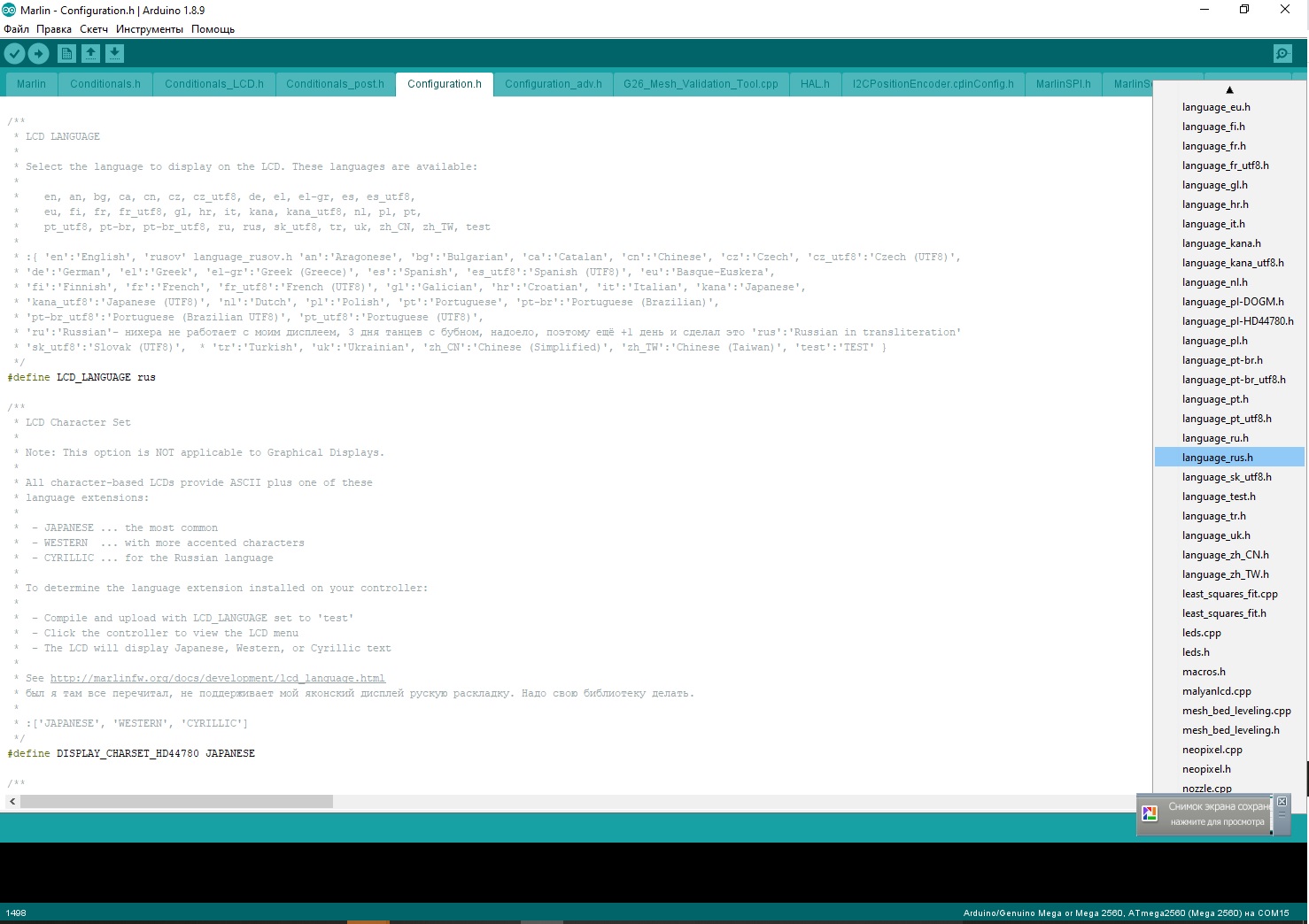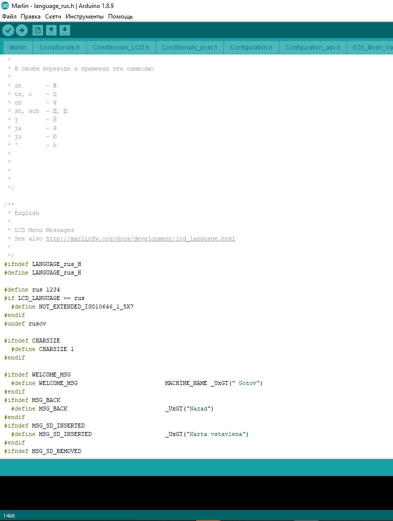 Русификация Marlin 1.1.9 прошла не так легко, как хотелось, пришлось делать транслитом ( транслитерация ).