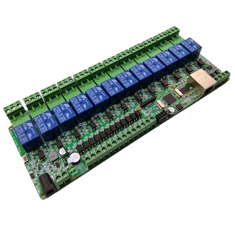 Кол-во IO - 8/8 и 12/12. Если кому-то в станке нужна добрая жменька входов и выходов (30,50,80,..), а в компе только одна Ethernet розетка, пачку этих плат можно воткнуть в копеешный Ethernet хаб, и уже его одним кабелем цеплять к компу.
