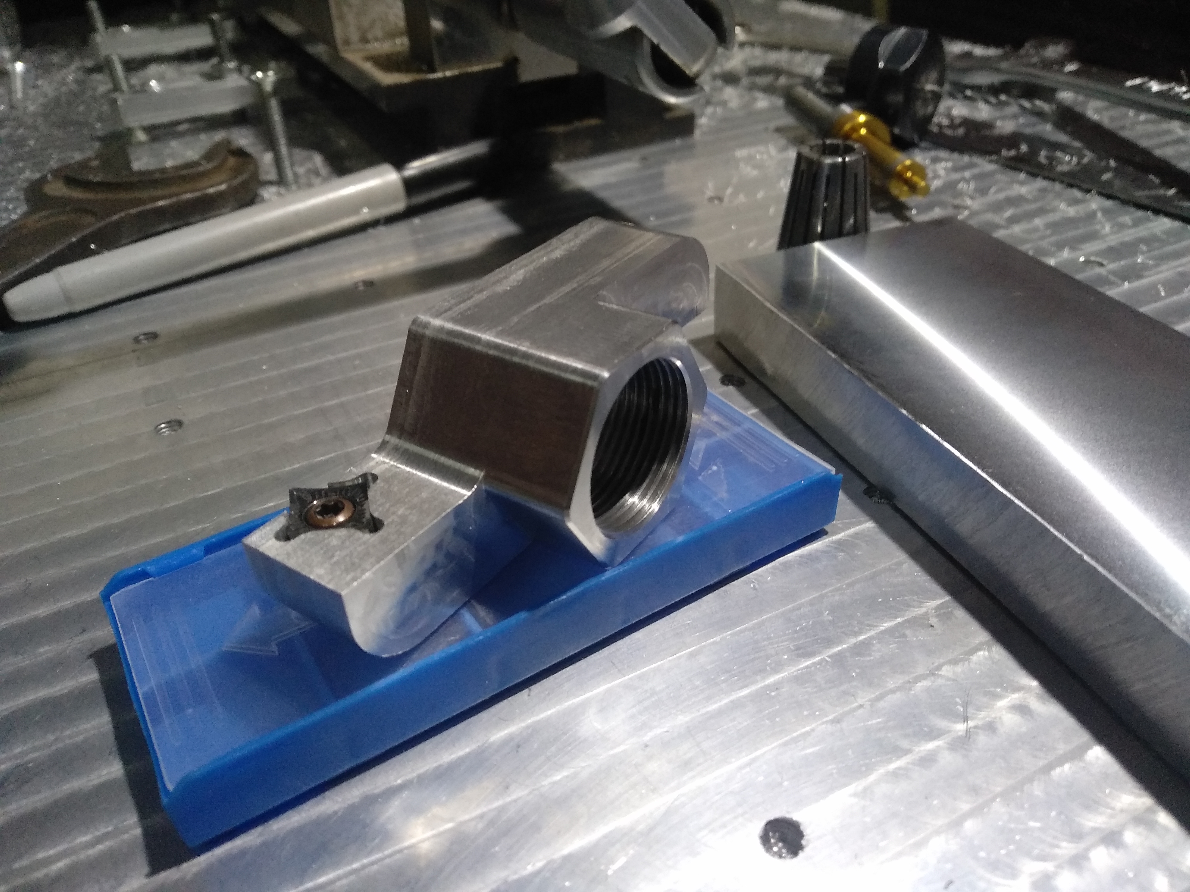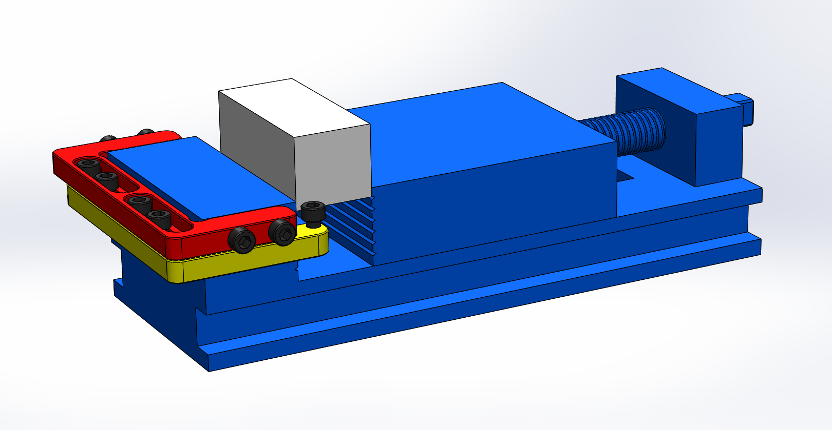 Парни, имеет право на жизнь такой упор на тиски? В тисках нет никаких отверстий и др для более простого решения. красная штука имитация струбцинки, желтая - подвижный упор. деталь упирается в шляпку винта М6, винт же в свою очередь может вкручиваться глубже/выше, чтоб при обдирке детали фрезой не вьехать
