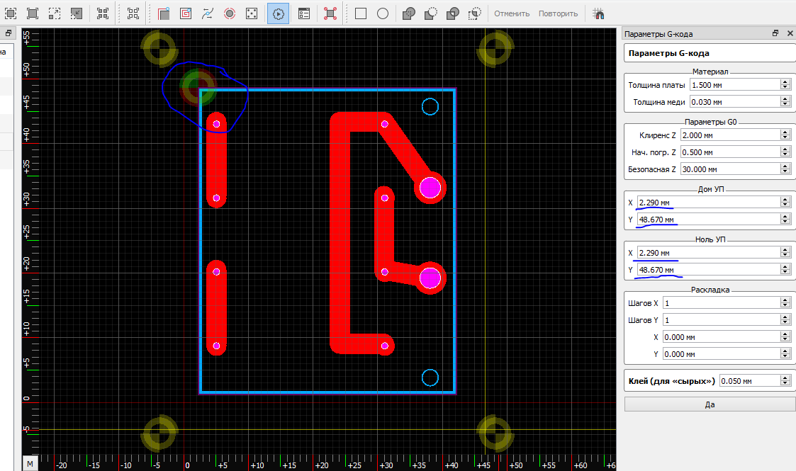 Service - Параметры -> Попадаем в Меню "Настройки". В нём "Gerber/G-код" в самом низу выставляем "Булавки Смещение Х Смещение Y" в нули, жмём ОК. (заодно можем изменить место Нуля и Дома УП). После этого загружаем Ваш gerber файл в G2G, отмечаем или не отмечаем "Пути апертур", жмём "Выбрать всё" и "Авторазмещение всех опорных точек". Вся плата разместится на экране, а булавки ни на йоту не выступят своим центром за границы платы, так как Вы расположили их так как Вам нужно, то есть не за пределами платы....alex250781 писал(а):И как убрать булавки в новой версии? А то при нажатии кнопки ВПИСАТЬ, плата из за булавок не вписывается в окно программы.