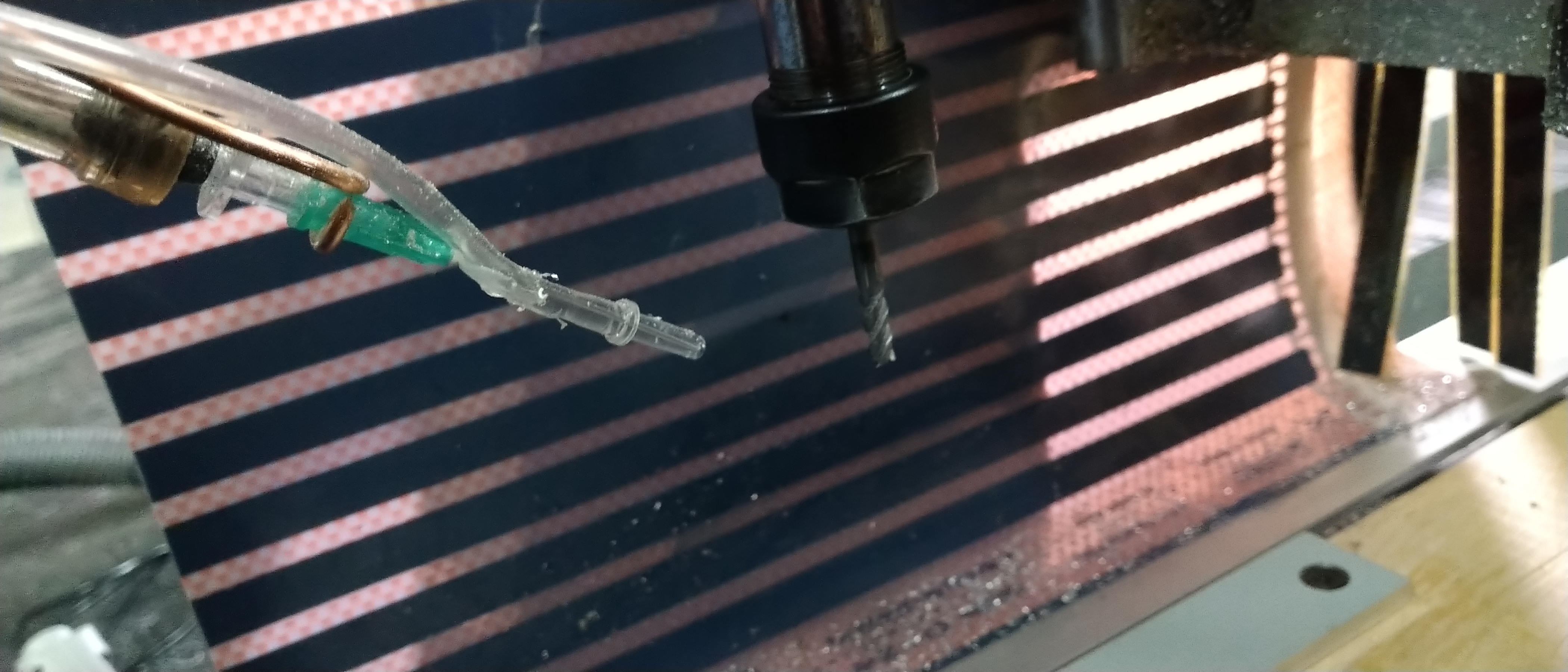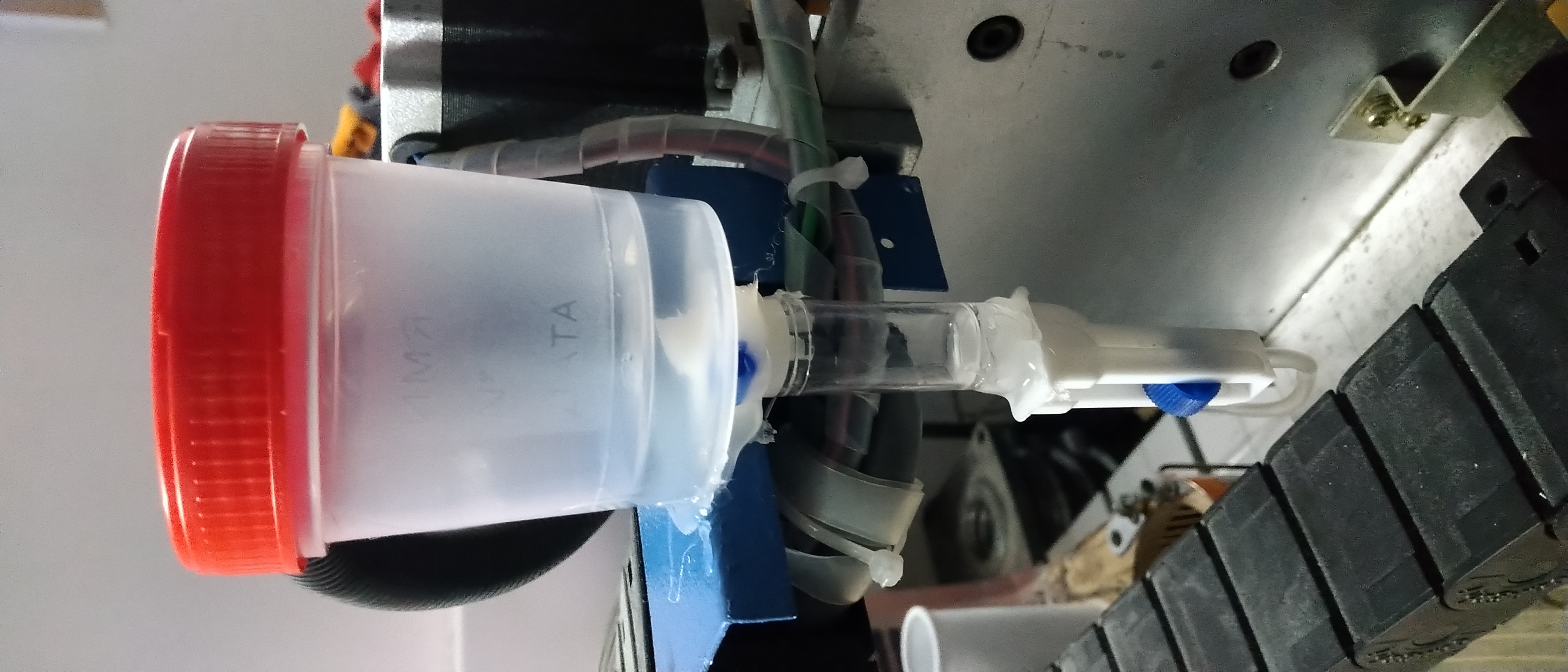 -так же из фанеры и теплого пола и запчастей из сифона сделал пылеуловитель -отжал дома старый небулайзер и сделал из него обдув (колхоз конечно, но помогает). Сопло - игла от шприца. Чуть позже сделал капельно-распылительную "систему подачи СОЖ" (если это можно ей назвать, но работает). О ней чуть ниже... -установил по углам уголки из д16т. Сделал круговой проход - уголки параллельны/перпендикулярны друг другу. Использую как нулевые точки. Теперь о "типа СОЖ". Состоит из капельницы и емкости (емкость небольшая, продается в любой аптеке
