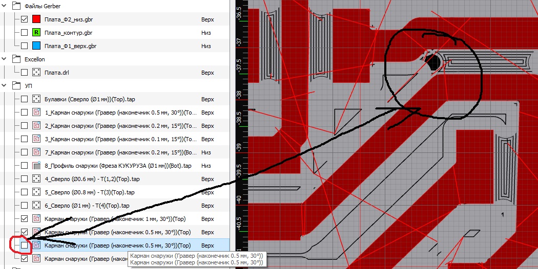 Шаг 2: Инструмент 2 - гравер Д=0,5мм; инструмент 1 - гравер Д=0,2мм. В этом варианте пропусков не остается. Теперь, по логике вещей, достаточно было бы удалить УП с фрезой 0,5 из шага 2 (мы же имеем УП с ней на шаге 1), но не тут то было - появляются не обработанные участки: