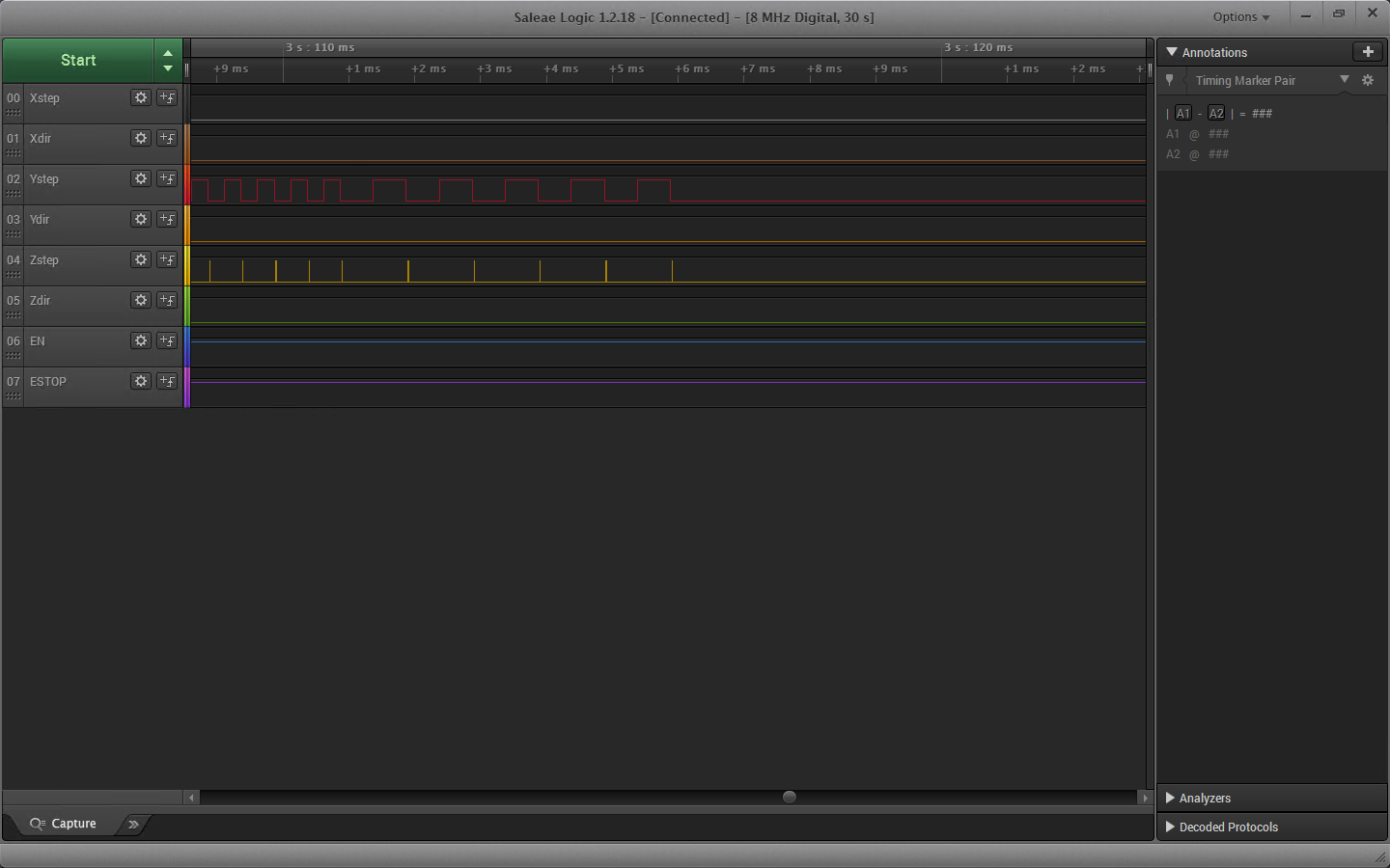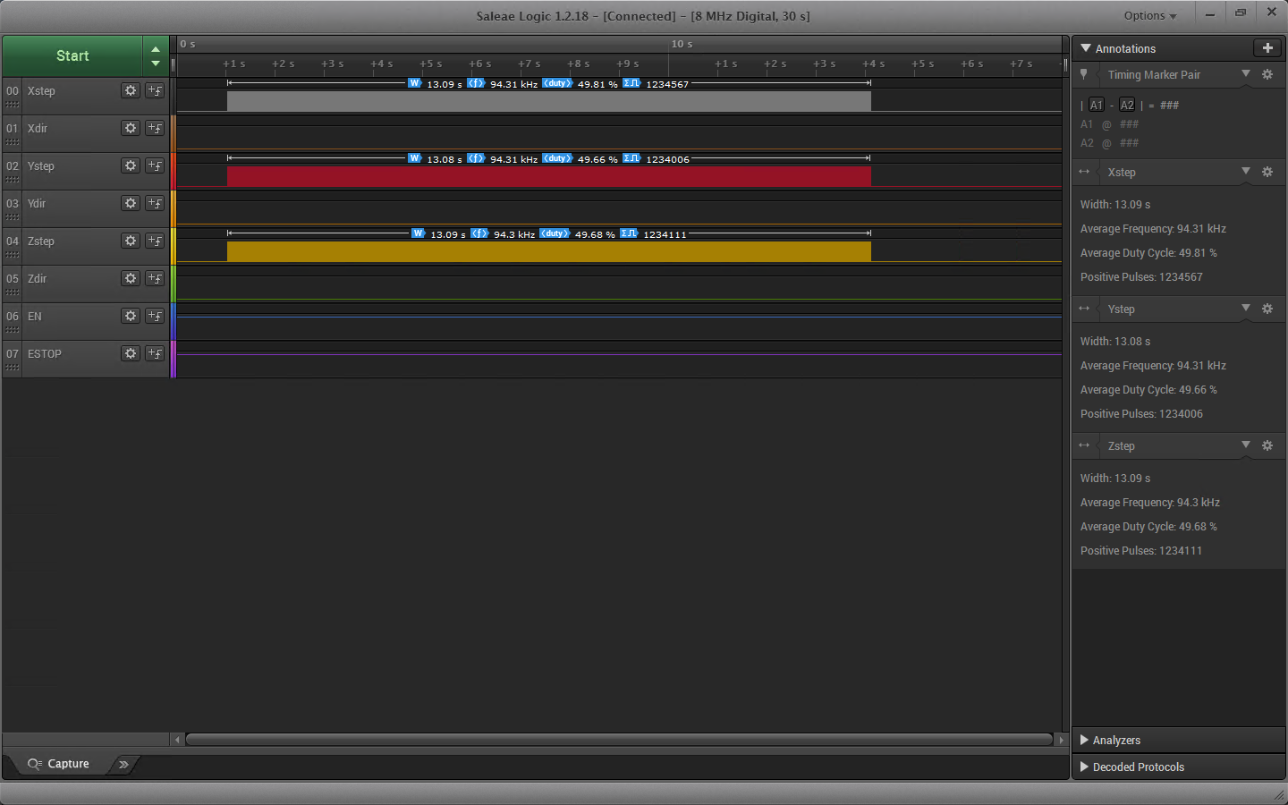 Добавил в драйвер arisc.stepgen интересную функцию управления скважностью STEP сигнала. Если какой-то из параметров steplen/stepspace равен нулю, то скважность будет всегда 50%. В данном примере для оси Z параметры steplen/stepspace = 4000/1000. А для оси Y они равны нулю, поэтому используется динамическая длина сигнала STEP. На осциллограмме это выглядит примерно вот так