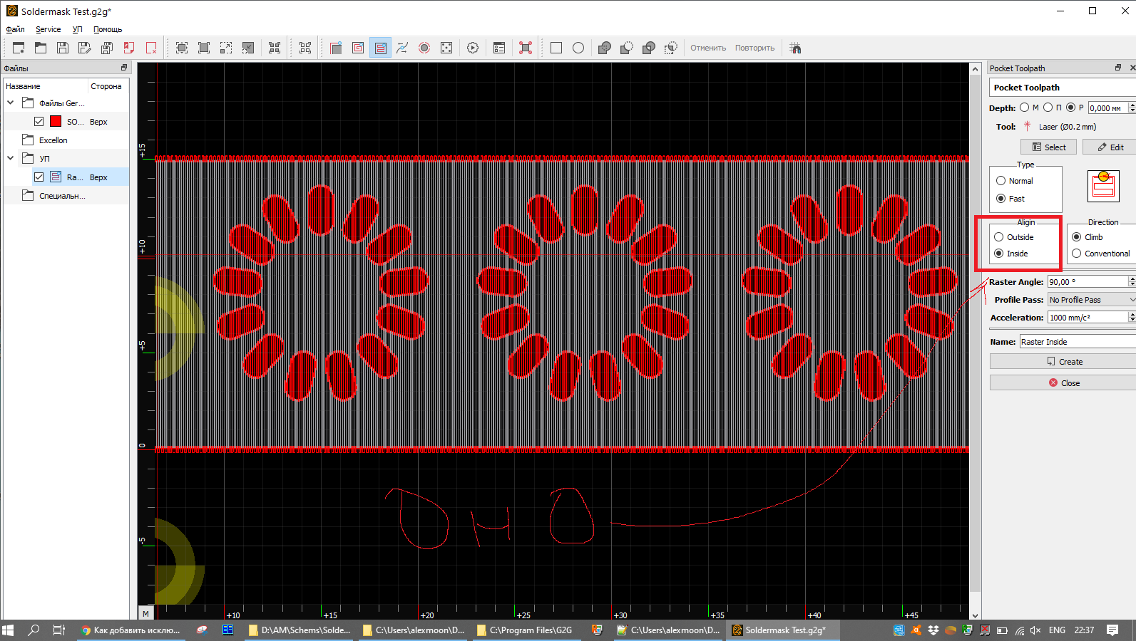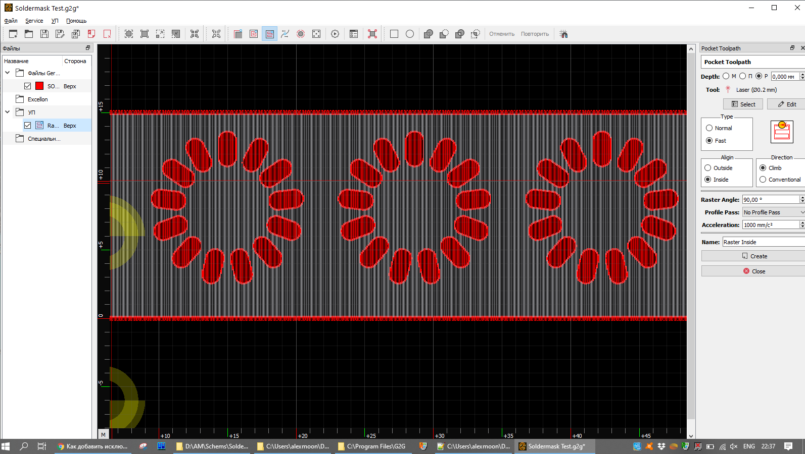 Чем больше ускорение, выставленное в УП PocketR, а желательно, чтобы оно было не больше $120, $121, тем (все зависит от разводки ПП) этот разгон ближе к контуру платы, а в идеале хорошо, чтобы он был внутри платы, недалеко от дорожек.Курдль писал(а):алгоритм разгона за пределами платы при растровом методе