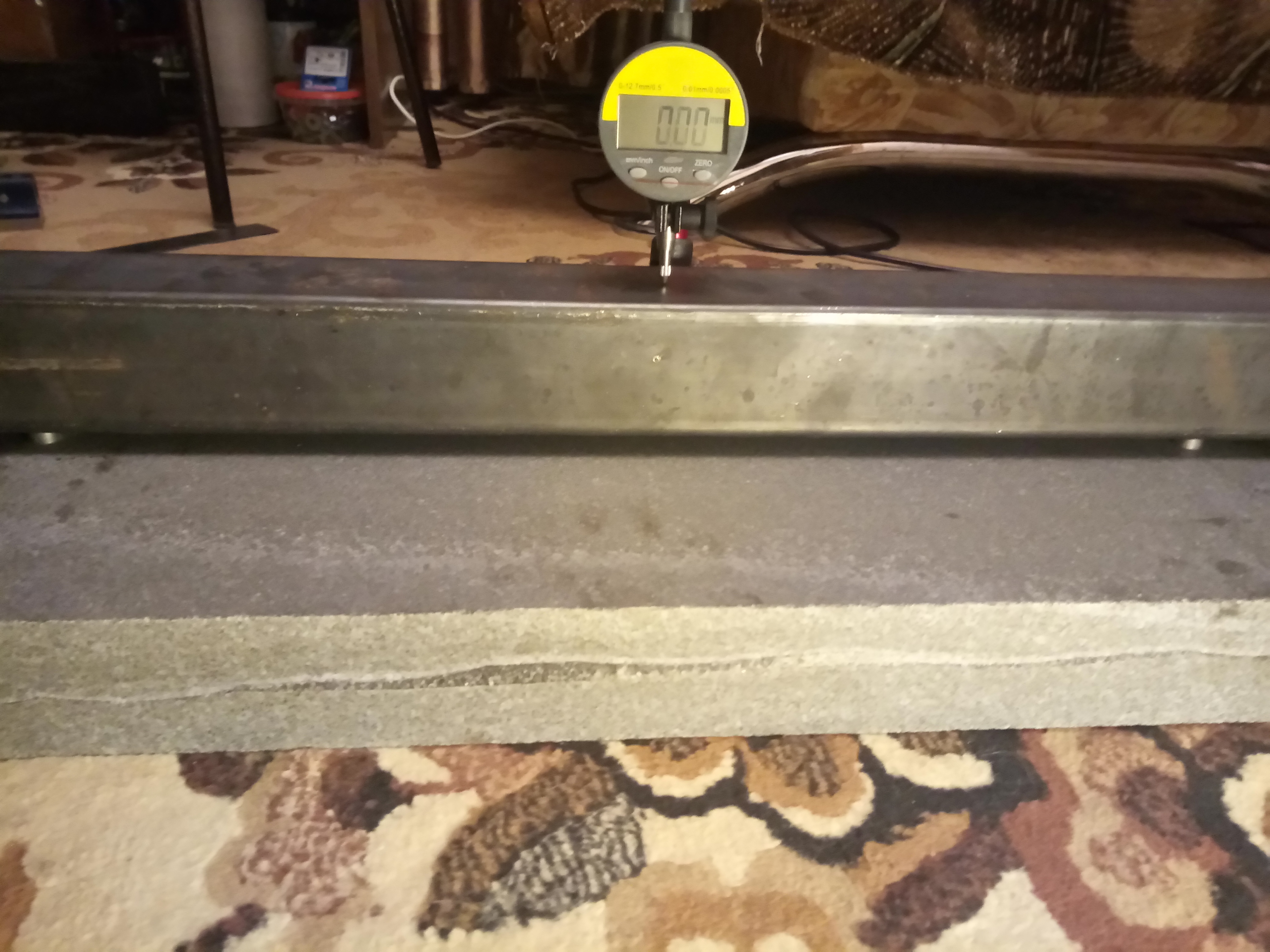 Гадаю из какой профильной трубы сделать раму. Под рукой 60х60х1,8мм. Расставил опоры под ней 500мм и вставал на неё с двумя блинами от штанги. Итого 102 кг прогиб 0,08мм. Если так, то взяв такую трубу и залив бетоном, получится очень жёсткая конструкция. Главное пролётов больших не делать. Под рельсы можно взять 80*60*2мм и бетон во внутрь. И подкладки под рельсы из 10 мм стали