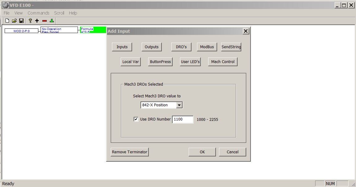 Генерируем новую”Lupu” для управления изменением частоты. В окне “ Add Input” выбераем “DROs”, там выбераем “202- Spin RPM - Overden” что тоже контролируетса Mach3.