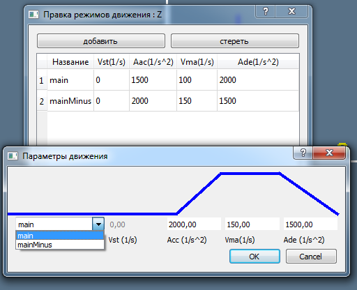 для удобства ввода параметров, стали доступны названия стандартных режимов т.е. при движении в положительную сторону (вверх) ось Z будет медленнее разгонять а тормозить быстрее.