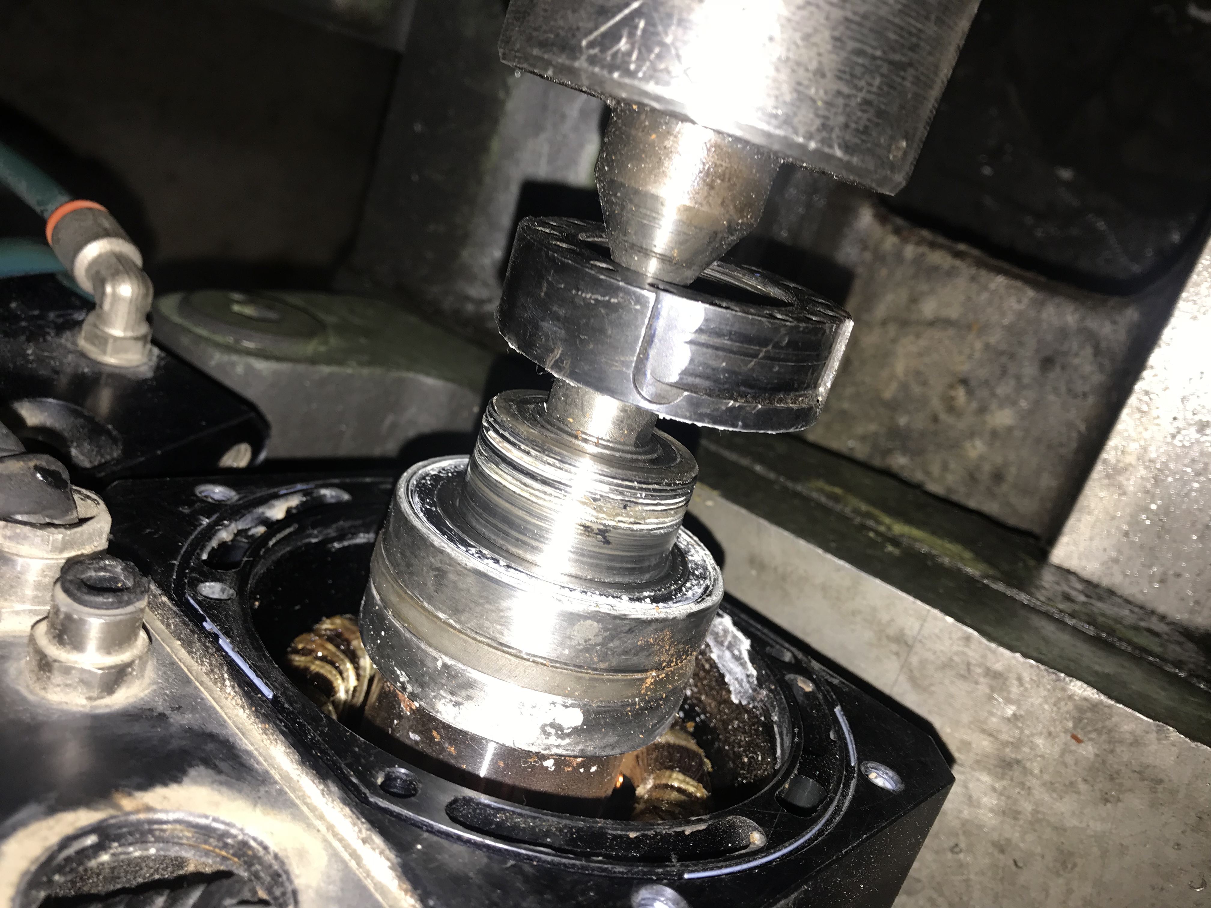 Вот так открутил гайку (открутилась без особых усилий) и выпрессовал подшипники с помощью ручного пресса. С вала (ротора) подшипы снялись руками, но проворачивание на валу не видно, так должно быть? Или кренить вал придётся чтоб плотнее сели?