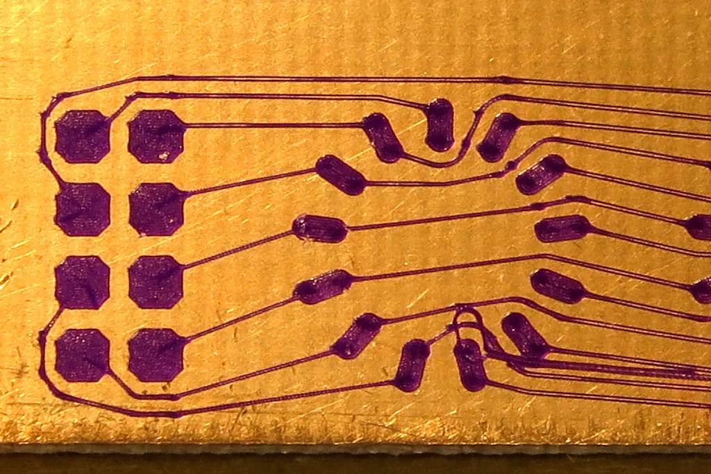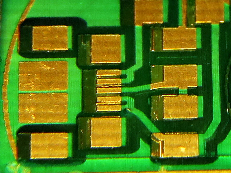 (просветы в маске смещены влево, т.к. тестовая плата фрезеровалась давно и центр координат точно выставить не представлялось возможным)