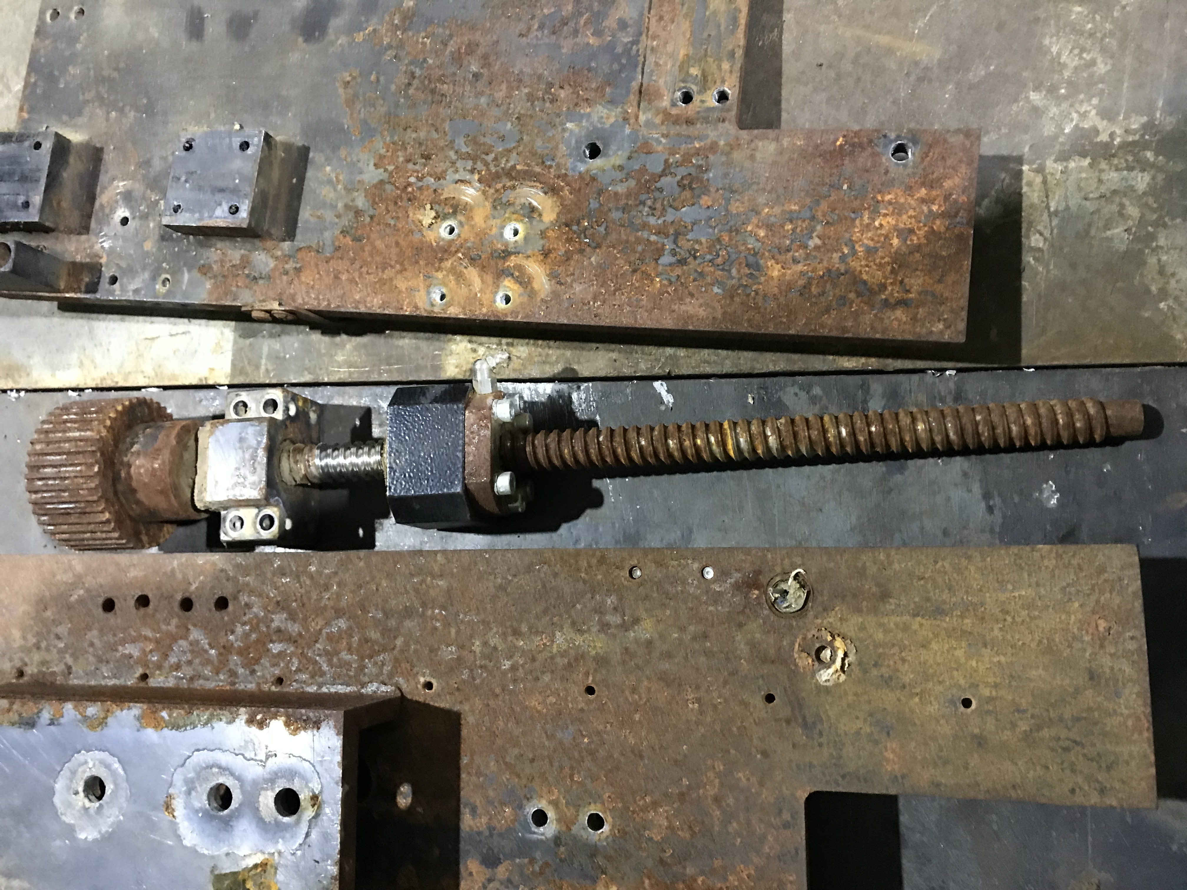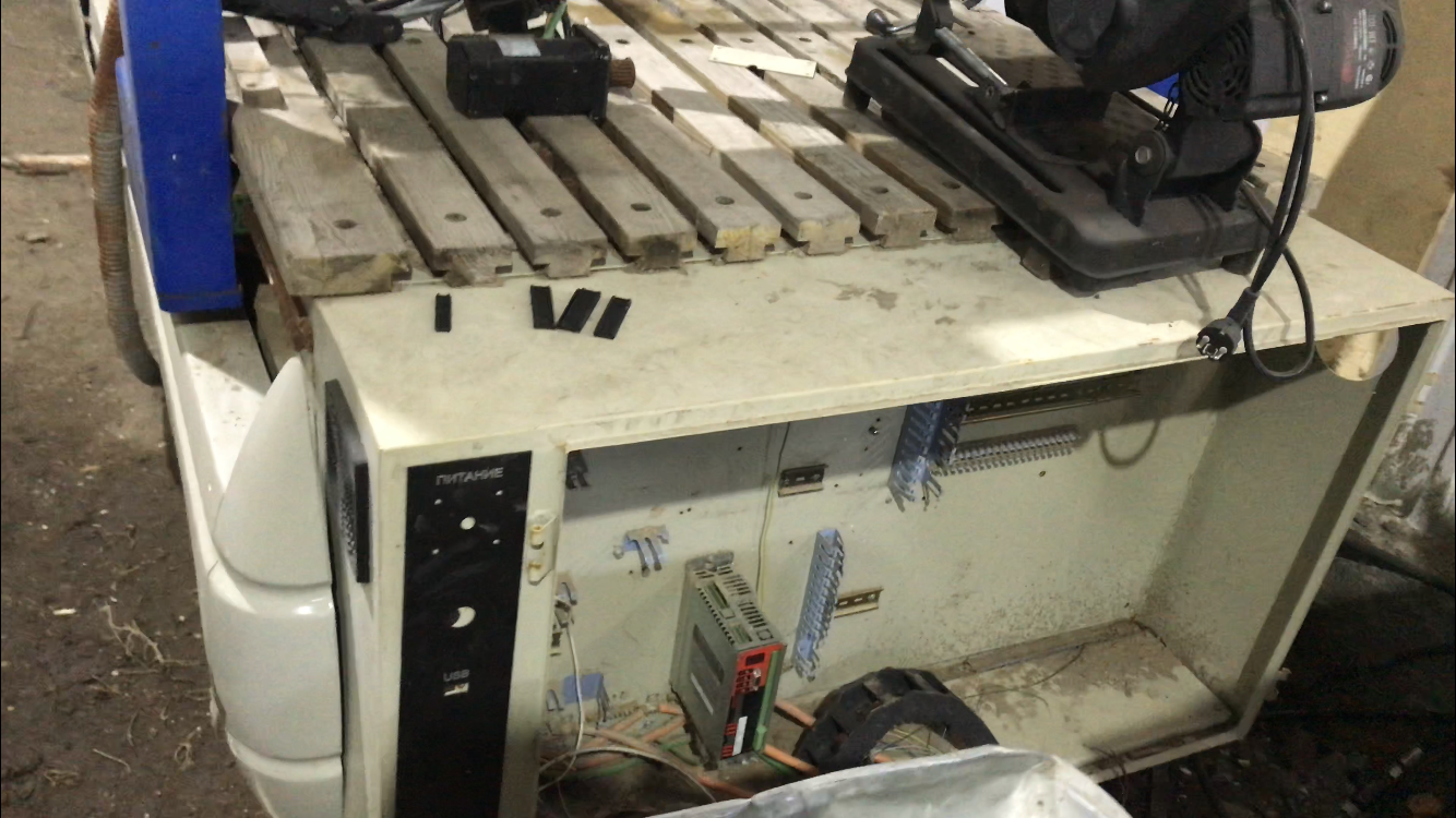 Урвал фрезер по пути в металлолом за не дорого, станок пару лет на улице пожил, собственно взял из за готовой механики на чугунной фрезерованной раме, да и портал мощный. Выглядит как будто на войне побывал :roll: Начали сегодня разбирать, из живой механики вижу пока только швп оси Y, может ещё серваки живые. Цель восстанавливать как будет время для собственных нужд.