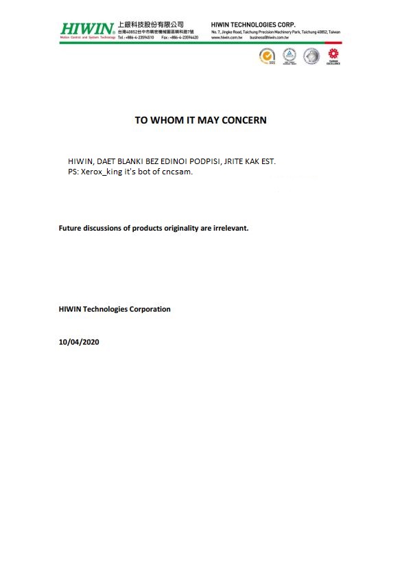 Всем привет , люди добрые, Форумчане , и те кто по случайности сюда попал. Тема оригинальности раскрыта не до конца, еще много материала, ждем официальный ответ компании HIWIN а так же комментарии представителей на территории РФ (задержка в связи с карантином, изоляцией, проблема с короновирусом COVID-19 планетарного масштаба, а ребята в Азии это тоже эпицентр хоть и бывший, везде проблему пандемии по разному решают , в Индии сильно бьют палками и громко ругаются матом на всех нарушающих режим- индусов много, их 1.3 ярда-тюрем на всех не хватит (поступила инсайдерская информация о том что в Чечне пошли по этому же пути но дополнили штрафами - правильное решение), в Италии не справляются крематории в сутки не менее 600 тел вывозят сочувствуем им, а новостей из Азии не так много, кроме как то, что вспышка уже прошла эпидемия пошла на спад и уже заработало метро. Поэтому мы ждем ответ, далее публикуем его, на днях видео про маркировку под разными углами. Всем желаем добра, будьте здоровы!
