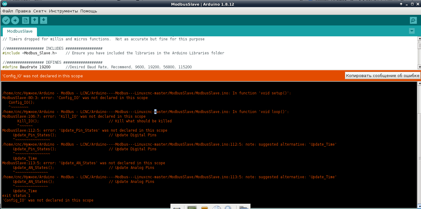 Скрипт gs2_vfd.c взятый отсюда компилируется БЕЗ ошибок, Но проект ардуины не компилируется. https://github.com/nkp216/Arduino----Modbus---Linuxcnc