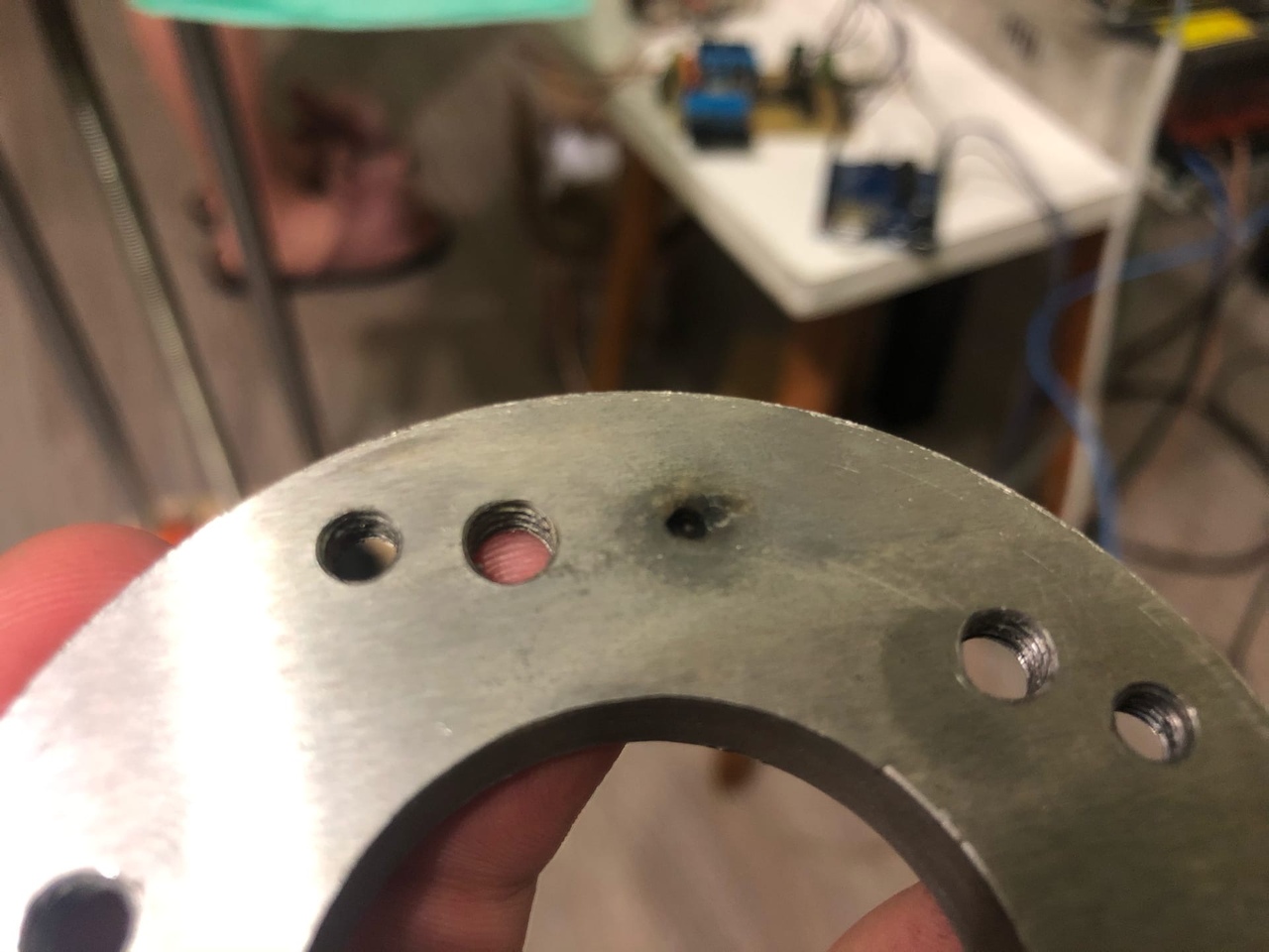 Получилось всеже сделать нормальное сквозное отверстие. Изменил основную несущую частоту на 8кГц и добавил дополнительную модуляцию с частотой 1кГц. За счет увеличения скорости опускания электрода удалось достич тока обработки 10А, можно дать и больше но залипания учащаются, да и если этот (рабочий ток) стараться удержать то транзисторы начинают нагреваться (всеже у меня их пока на плате не много). На данном этапе уперся в обратную связь с приводом, варианта действий два: подключить связь от платы AutoCut - это так и так надо делать, и второй вариант сделать самостоятельный контроль скорости в зависимости от тока.