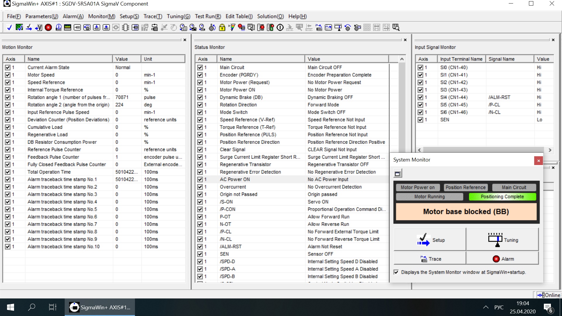 Друзья, подскажите пожалуйста, мучаю сервопак SGDV-5R с мотором SGMPS-08 в Sigmawin+ версии 5. Не удается покрутить джогом (на дает даже нажать кнопку Servo On в окошке джога) ни в программе, ни кнопками на сервопаке, вылетает ошибка что нет питания.