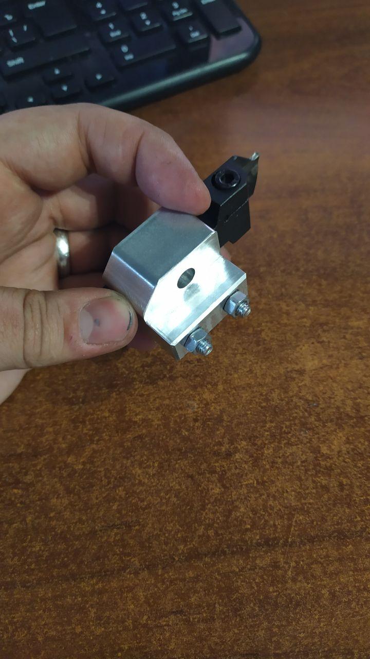 В постоянной борьбе со станиной станка приходится городить вот такие конструкции для отрезного резца. Резец запрессован в паз, винты для затяжки к голове, отверстие для затяжки клина для большей жесткости. Может кто подскажет ещё какие либо варианты отрезных, с небольшой головкой? Потому что в данном резце что в 10й державке, что в 12, часть с пластиной одинаковая в длинну, и она при повороте револьверки цепляется за станину.