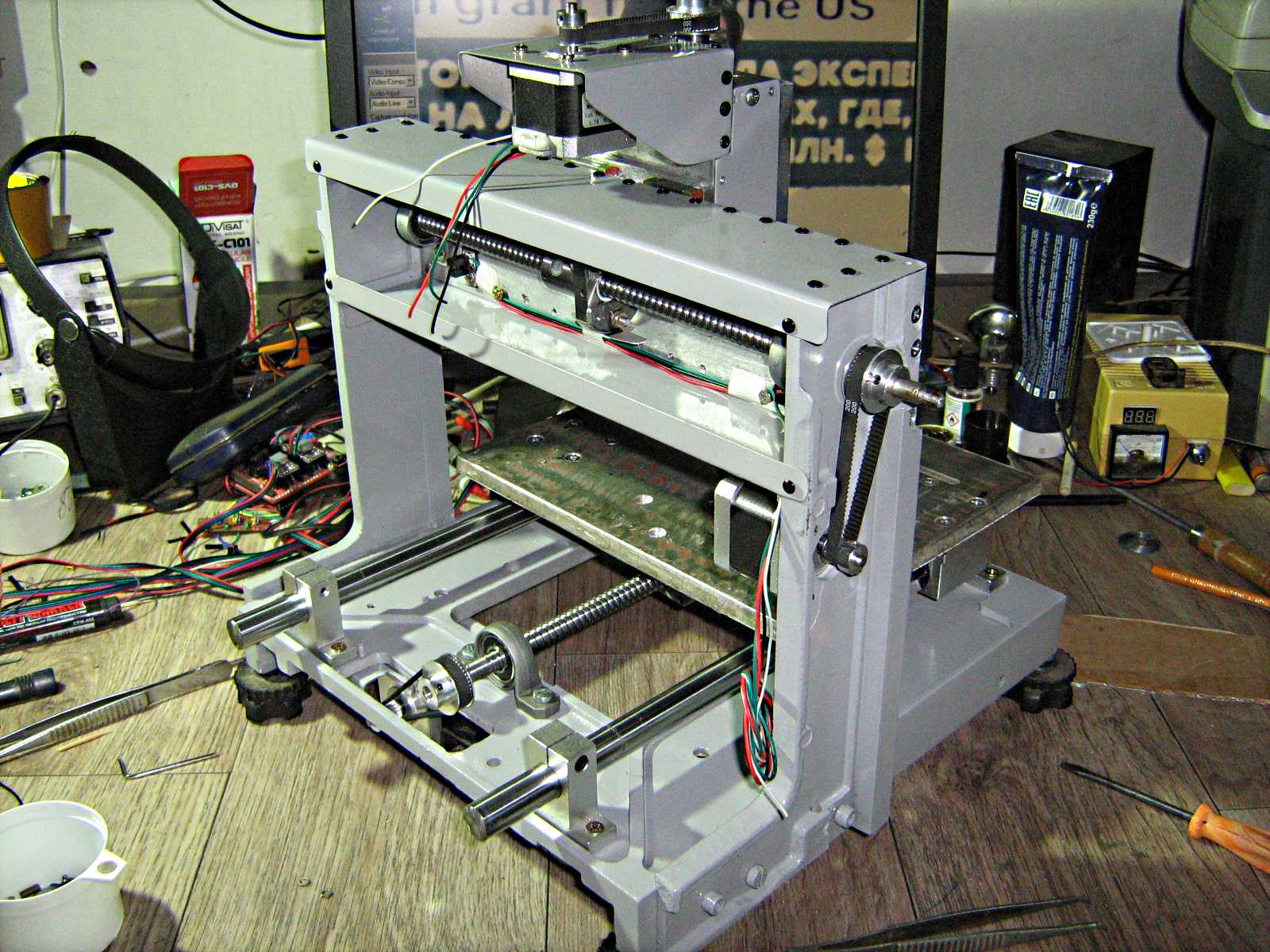 Теперь немного о конструкции. Собственно она определялась имеющимися в наличии компонентами. В наличии были две цилиндрических направляющих 16 мм, и две рельсы 9 мм. ШВП 1204 350мм и две по 150 мм. Собственно от этого и плясал. Основание и стойки вырезаны из куска шасси старинного ТВ передатчика. Оси Z и X из дюралевой полосы 80х10мм. Из за ограничения ширины полосы в 80 мм, для оси Z пришлось использовать валы 8 мм. Да и то гайку ШВП на пару мм пришлось стачивать на наждаке, а в корпусе гайки профрезеровать выемки под валы. Корпус гайки по длине разделен пополам, что несколько увеличивает пределы перемещения. Двигатели 42 мм на 1,7А. Передача на валы- кольцевой ремень ГТ2 6мм. Зубчатые шкивы 16 и 30 зубов. Ось Х усилена стальными пластинами 50х1,5 мм. Без них был заметный изгиб при нагрузке на шпиндель. Электроника - китайская плата на 4 драйвера. Подключена напрямую к LPT порту. Управление - МАЧ-3. Блок питания-временно 16 в 3А. Концевики будут оптические. В дальнейшем попробую ГРБЛ и автономный контроллер. Посмотрим что больше понравится. Во всяком случае на лазерном гравере автономный контроллер прижился. В принципе уже достаточно уверенно грызет дерево и пластик. Но ввиду отсутствия цанг (есть только 6 мм) поэкспериментировать удалось только с трех-перой фрезой по металлу. При съеме дюраля 0,5 мм и скорости 400 мм/мин работает достаточно уверенно. На столе есть след от этого случайного эксперимента. Осталось разобрать, покрасить и закрутить недостающие винты крепления рельс и кареток. Возможно это избавит от резонансов на низких скоростях.