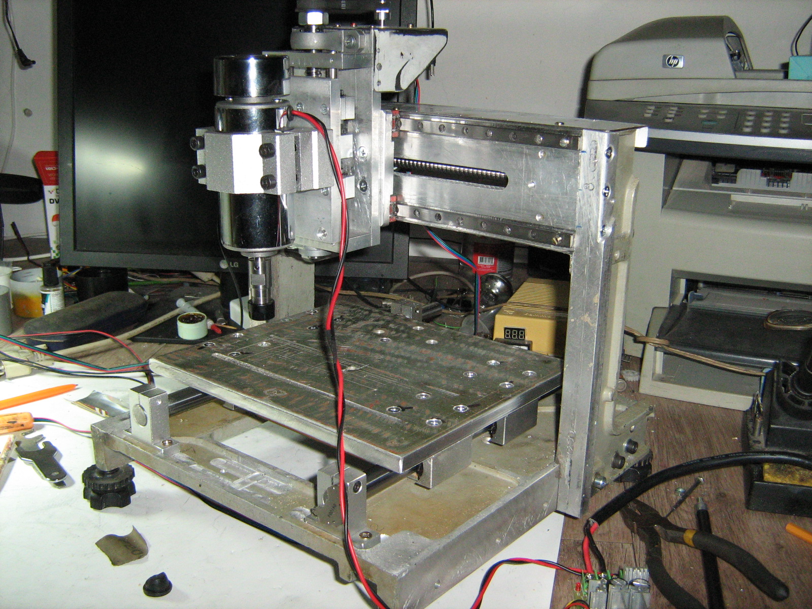 Теперь немного о конструкции. Собственно она определялась имеющимися в наличии компонентами. В наличии были две цилиндрических направляющих 16 мм, и две рельсы 9 мм. ШВП 1204 350мм и две по 150 мм. Собственно от этого и плясал. Основание и стойки вырезаны из куска шасси старинного ТВ передатчика. Оси Z и X из дюралевой полосы 80х10мм. Из за ограничения ширины полосы в 80 мм, для оси Z пришлось использовать валы 8 мм. Да и то гайку ШВП на пару мм пришлось стачивать на наждаке, а в корпусе гайки профрезеровать выемки под валы. Корпус гайки по длине разделен пополам, что несколько увеличивает пределы перемещения. Двигатели 42 мм на 1,7А. Передача на валы- кольцевой ремень ГТ2 6мм. Зубчатые шкивы 16 и 30 зубов. Ось Х усилена стальными пластинами 50х1,5 мм. Без них был заметный изгиб при нагрузке на шпиндель. Электроника - китайская плата на 4 драйвера. Подключена напрямую к LPT порту. Управление - МАЧ-3. Блок питания-временно 16 в 3А. Концевики будут оптические. В дальнейшем попробую ГРБЛ и автономный контроллер. Посмотрим что больше понравится. Во всяком случае на лазерном гравере автономный контроллер прижился. В принципе уже достаточно уверенно грызет дерево и пластик. Но ввиду отсутствия цанг (есть только 6 мм) поэкспериментировать удалось только с трех-перой фрезой по металлу. При съеме дюраля 0,5 мм и скорости 400 мм/мин работает достаточно уверенно. На столе есть след от этого случайного эксперимента. Осталось разобрать, покрасить и закрутить недостающие винты крепления рельс и кареток. Возможно это избавит от резонансов на низких скоростях.