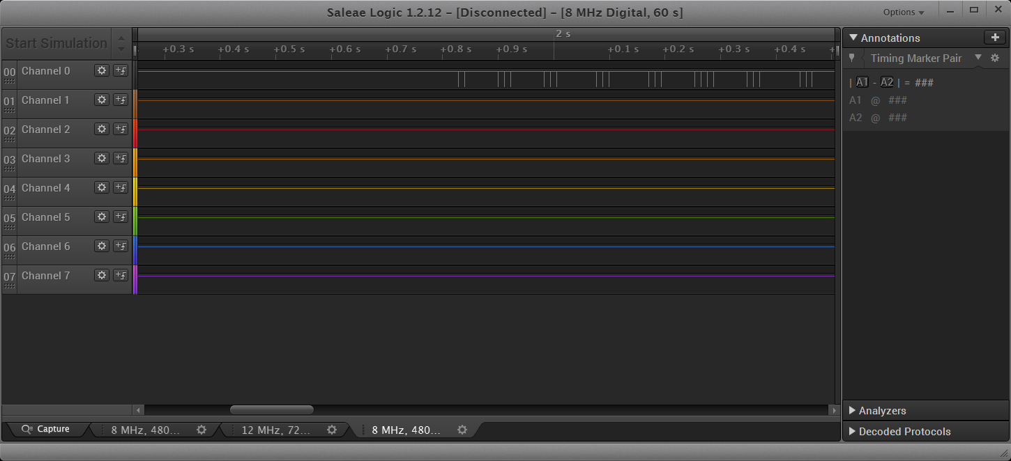 Достал из закромов контроллер MK1. Открыл софт версии 2.10.1204.201, сижу проверяю работу. С виду всё хорошо. Но почему-то аналоговый выход (0-10V) показывает 10.5V при любых оборотах шпинделя. Смотрю что за конвертер.. LM2917. Это, как я понял, конвертер кол-ва импульсов в напряжение. Перед входом в LM2917 стоит оптопара EL817, которой управляет нога микроконтроллера через резистор 330 Ом. Смотрю что есть на выходе оптопары логическим анализатором. Всего пара импульсов за 10 сек. А временами даже ни одного. Проверяю импульсы прямо на ноге МК и, о чудо, они там есть! Причем, видно, что их кол-во зависит от оборотов шпинделя в программе. Но странно другое. Длина импульсов меньше микросекунды!