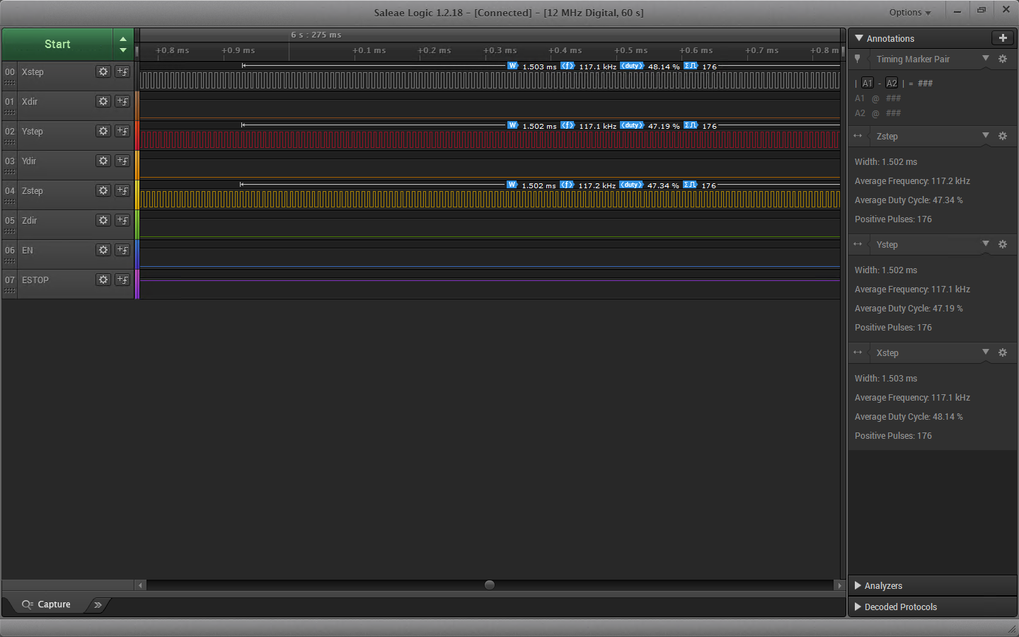 Но, вроде, всё получилось. Сейчас на осциллограмме я вижу самый ровный вывод шагов за всю историю проекта. Чтобы победить все задержки на высоких частотах, я смещаю вывод шагов чутка вперёд. Тогда у процессора есть достаточно времени, чтобы с умом продумать новое задание. Не отвлекая сопроцессор.