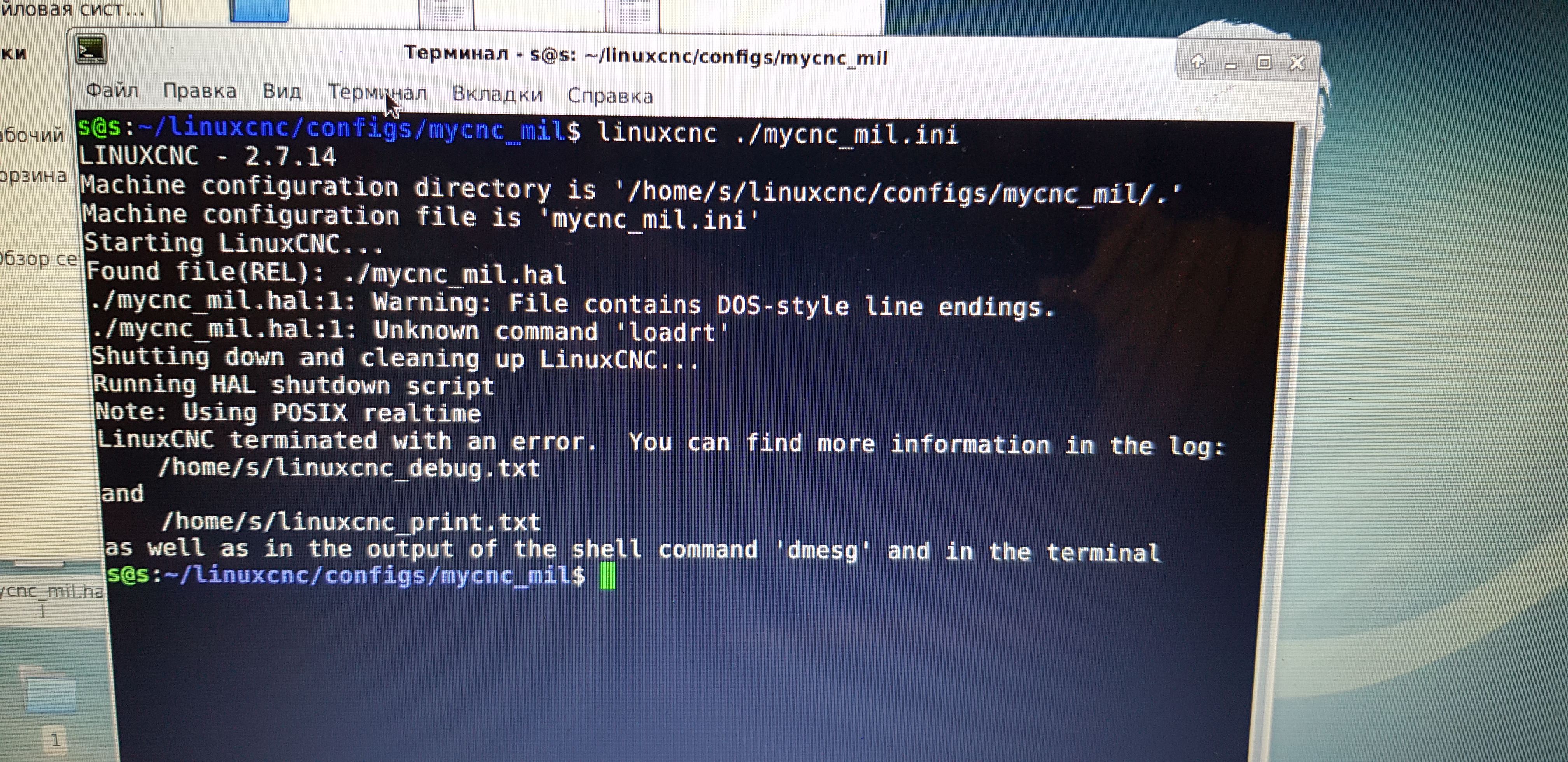 Мой конфиг у меня не стартует, так как карта на работе. Так что пробуй мой конфиг еще раз. Но никаких ошибок с loadrt быть не должно!! Это что-то в системе не то. Как ставил дебиан? как ставил linuxcnc?