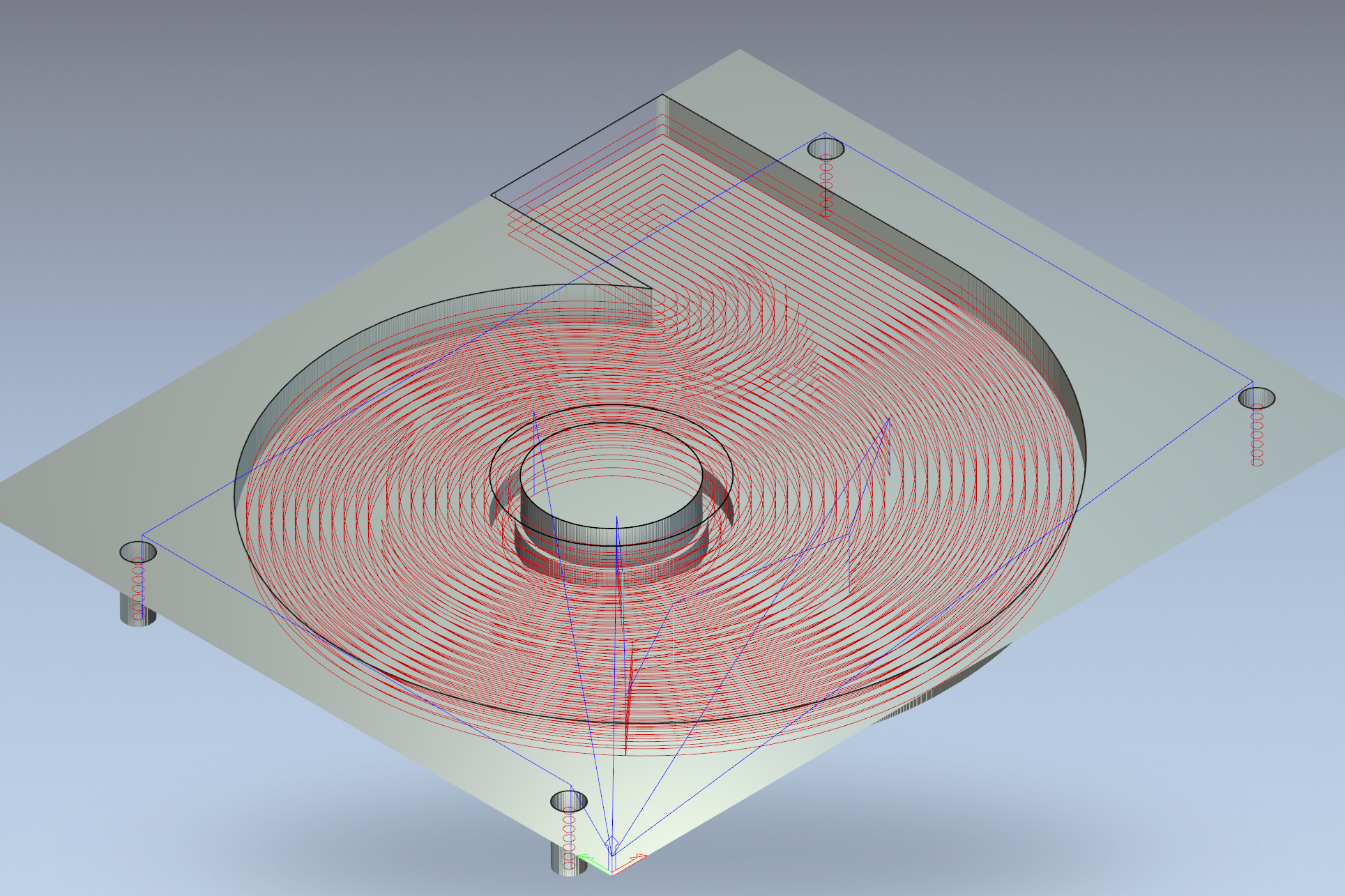 Сначала синяя тректория, потом зелёная (попутное фрезерование).