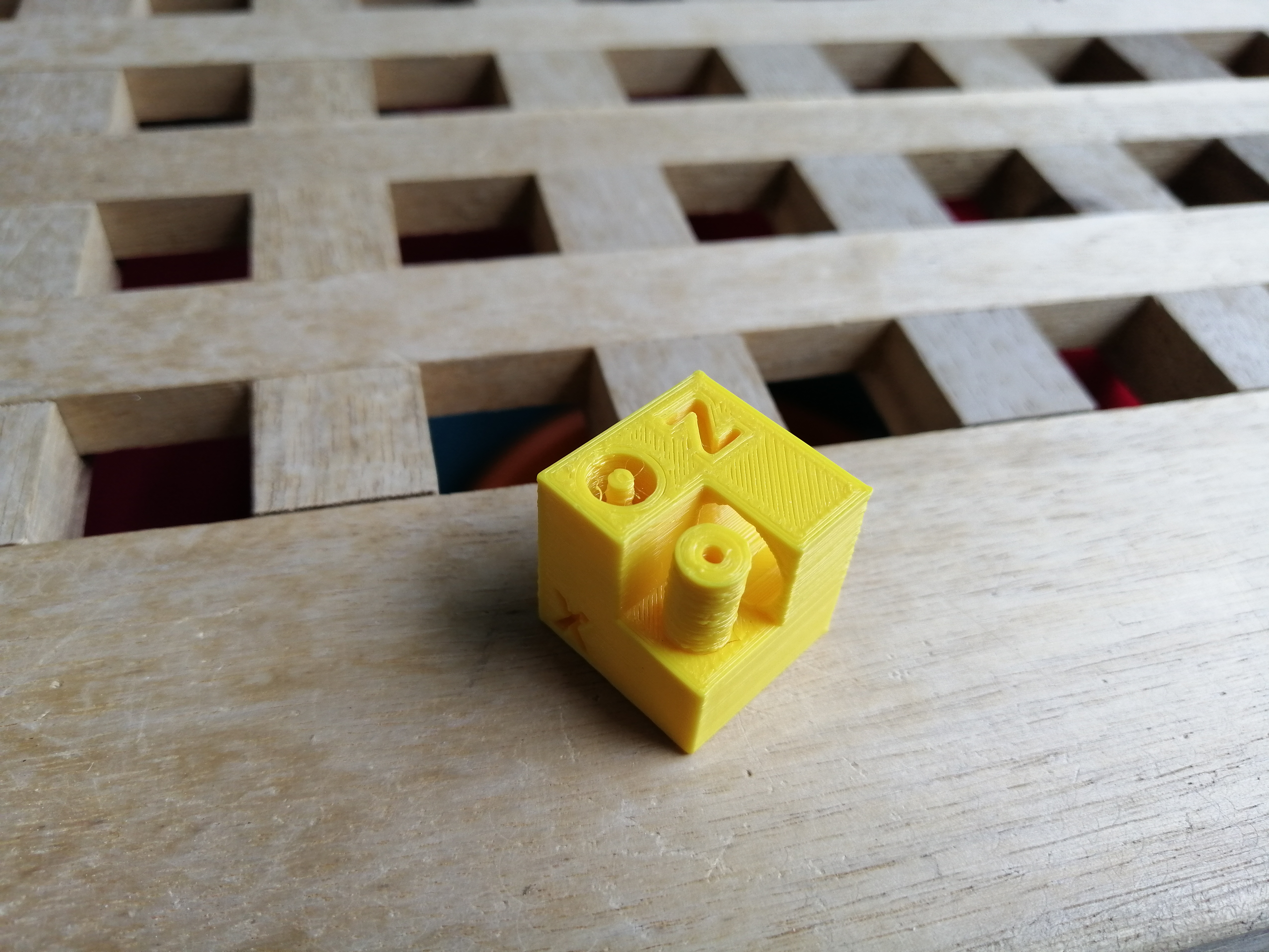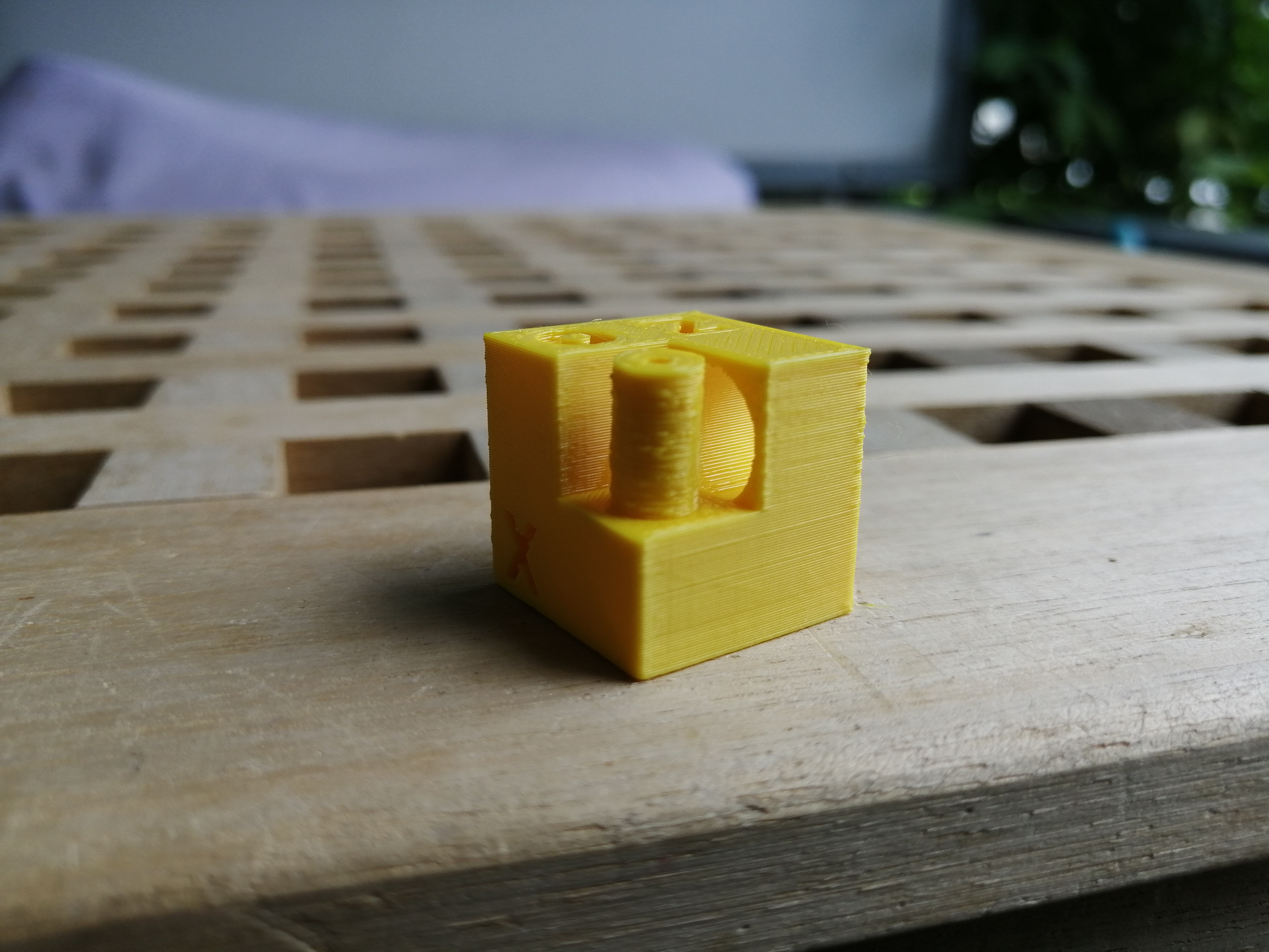Вот кубик напечатанный через 10 минут после этого пенала для проверки. Столбик, кстати, почему-то тоже кривой, но думаю из-за скорости или температуры.