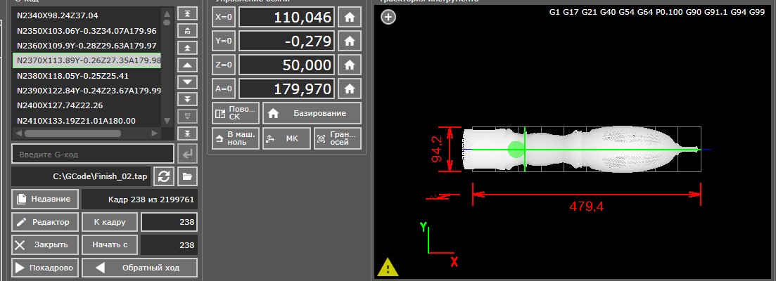 При запуске G-кода с определённой строки Pumotix не просто начинает выполнение с этого места, а восстанавливает состояние параметров интерпретатора для данного кадра, как если бы G-код был выполнен с самого начала. Это позволяет, например, если G-код состоит из двух частей, разделённых командой G92, сразу запустить обработку со второй части, с применением соответствующего смещения.