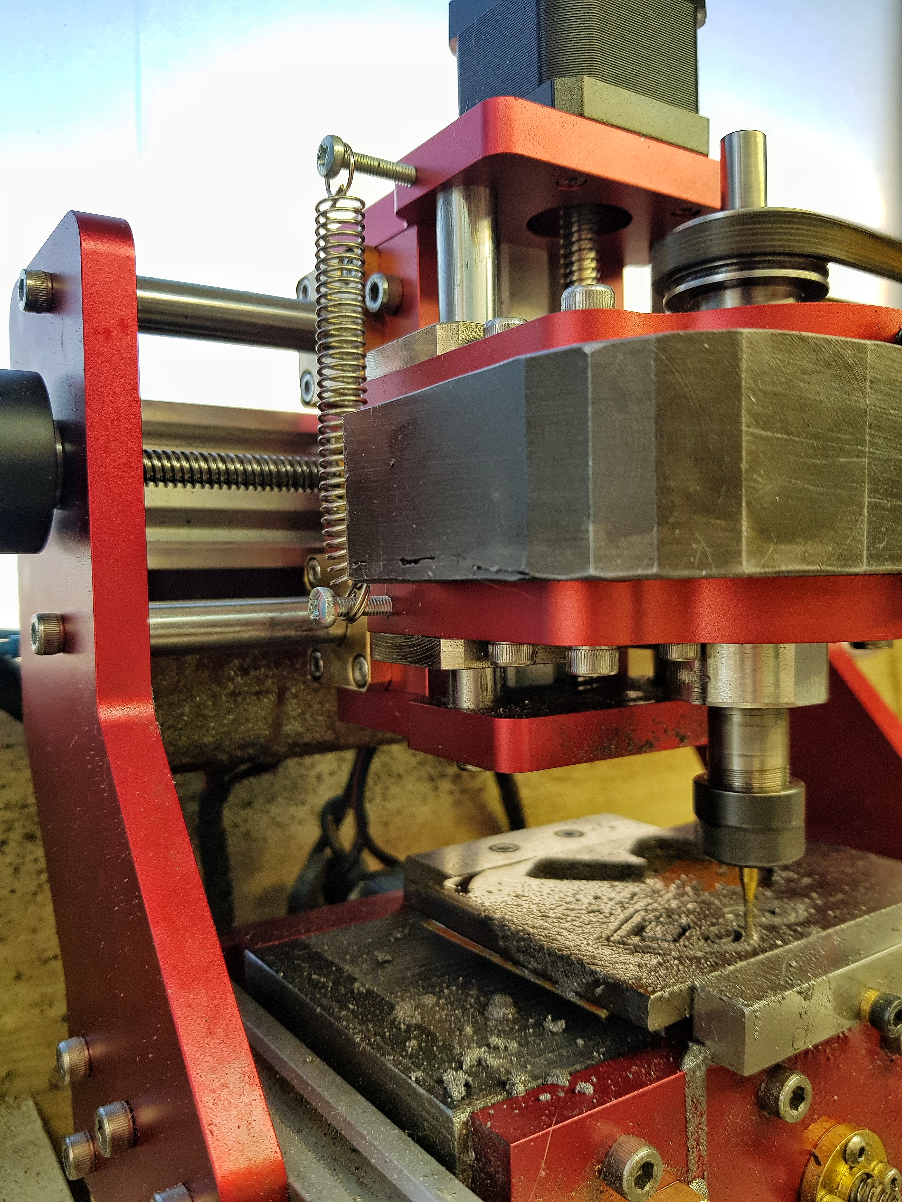 Как выяснилось, помимо прочих апгрейдов, добавление пружин по бокам благоприятно сказалось на тишине и чистоте резки по железу. Пружина от настольной лампы, разделил на 2. Немного поиграл с усилием, главное чтоб голова была всегда поджата вверх, но у шаговика хватало сил прокрутить вниз. Тогда резьбовая гайка витками ограничивает только верх а люфт в гайке Z не так страшен (что с люфтом по вертикали без пружин неизбежно приводило к раздроблению фрезы)