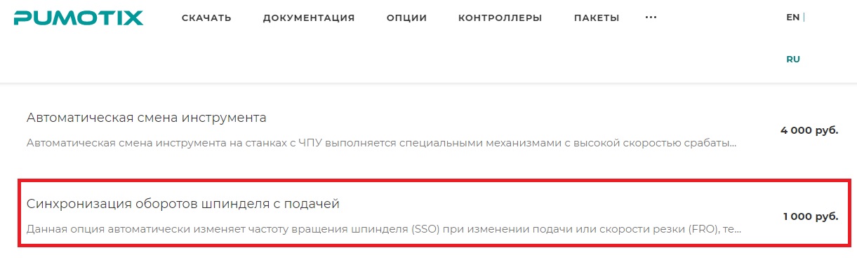 Именно это и сказано мной в предыдущем комментарии. Это чисто программная опция, связывающая задание оборотов шпинделя с рабочей подачей для фрезерных станков.Andrey.cz писал(а):pm_dev писал(а): Сейчас такой аппаратной функции пока нет. О всех существенных изменениях в функционале PUMOTIX мы всегда стараемся оповещать в этой теме. История изменений и дополнений от версии к версии доступна для ознакомления здесь.