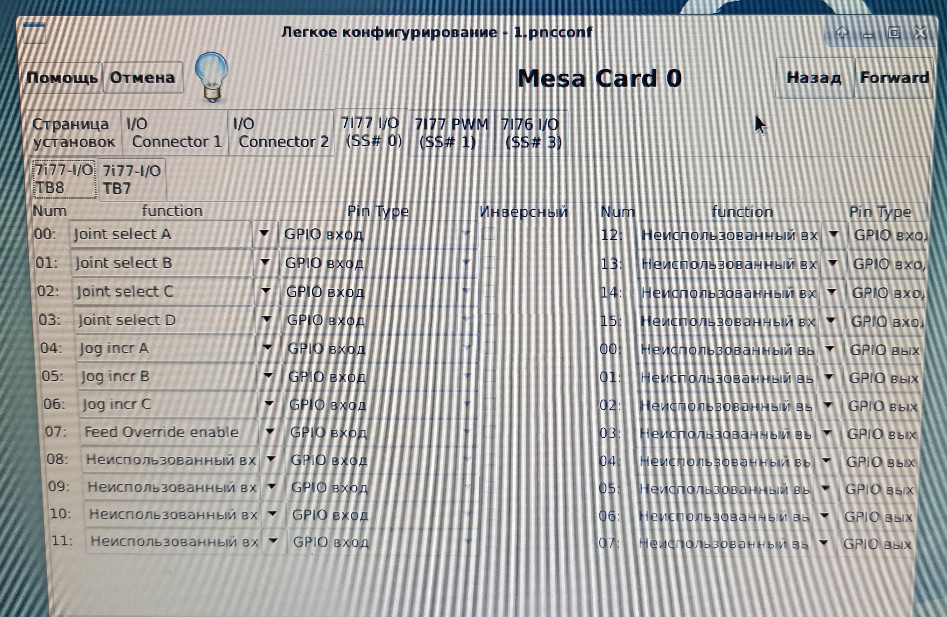 Теперь о настройке через визард. Таким образом настраивается большинство функций. Через HAL я прописываю только пины для ladder. Но у меня таким образом MPG настроить не получилось. Пины назначал таким образом, как на фото. В HallShow они работают. В реальности нет. Как понять, в каком месте не работает - не знаю. Через HAL тоже не работает, ругается на неправильные пины при запуске. Прошу совета у бывалых.