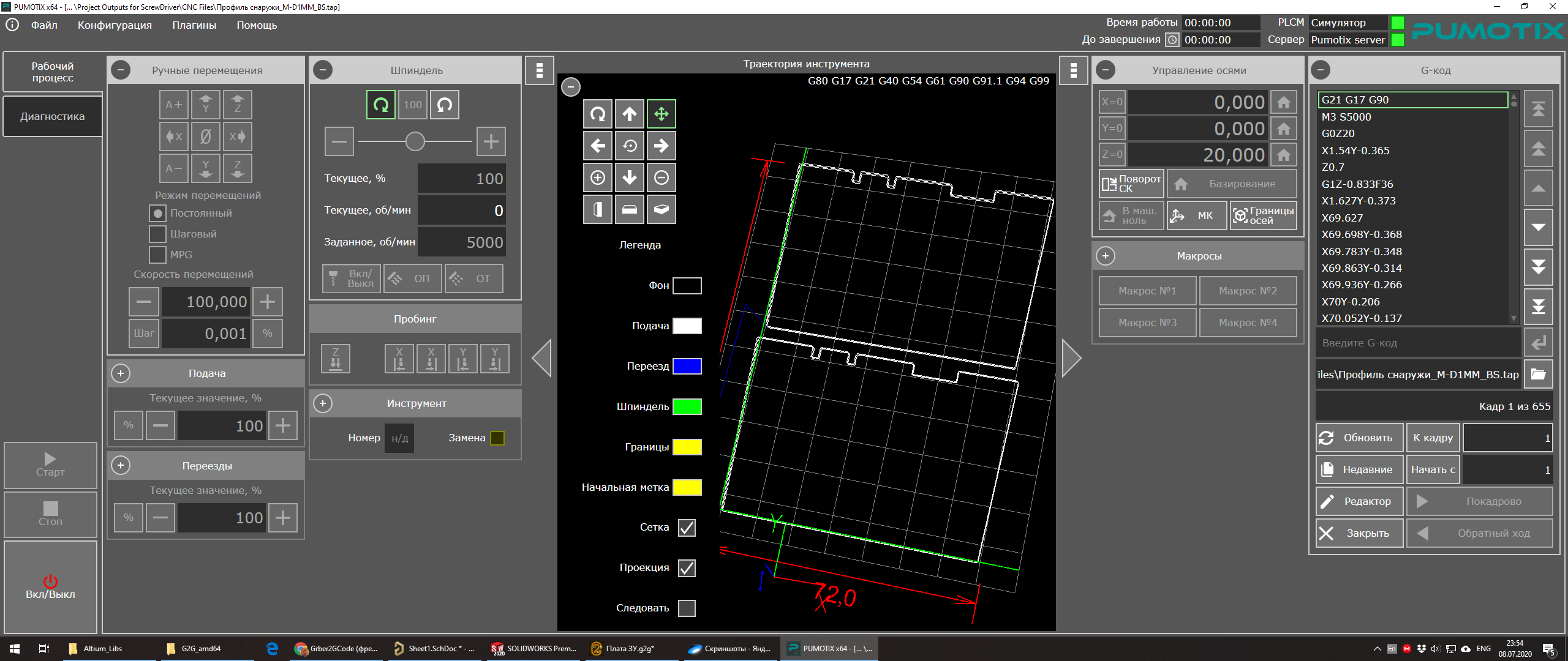 Сегодня протестировал измененную версию, к сожалению сверловка не вернулась и время расчета УП увеличилось до бесконечности. Пришлось делать отмену операции, закрывать программу, подзависла, однако. И поэтому скрины получить не удалось. В версии 7.8.4 эта же плата получилась влет!X-Ray писал(а):Пы.Сы. Теперь и Сверловка фрезеровка, поддержка Г00 - Г03 (Г05 по дефолту вернул).