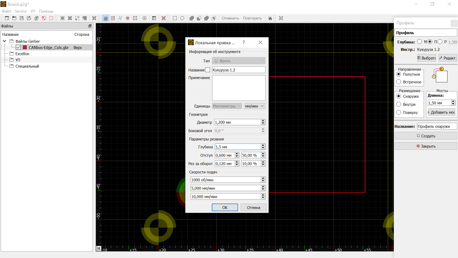 Толщина платы 1,5 мм.Выбираю инструмент фрезу ,при выборе задаю глубину реза 1,5 мм
