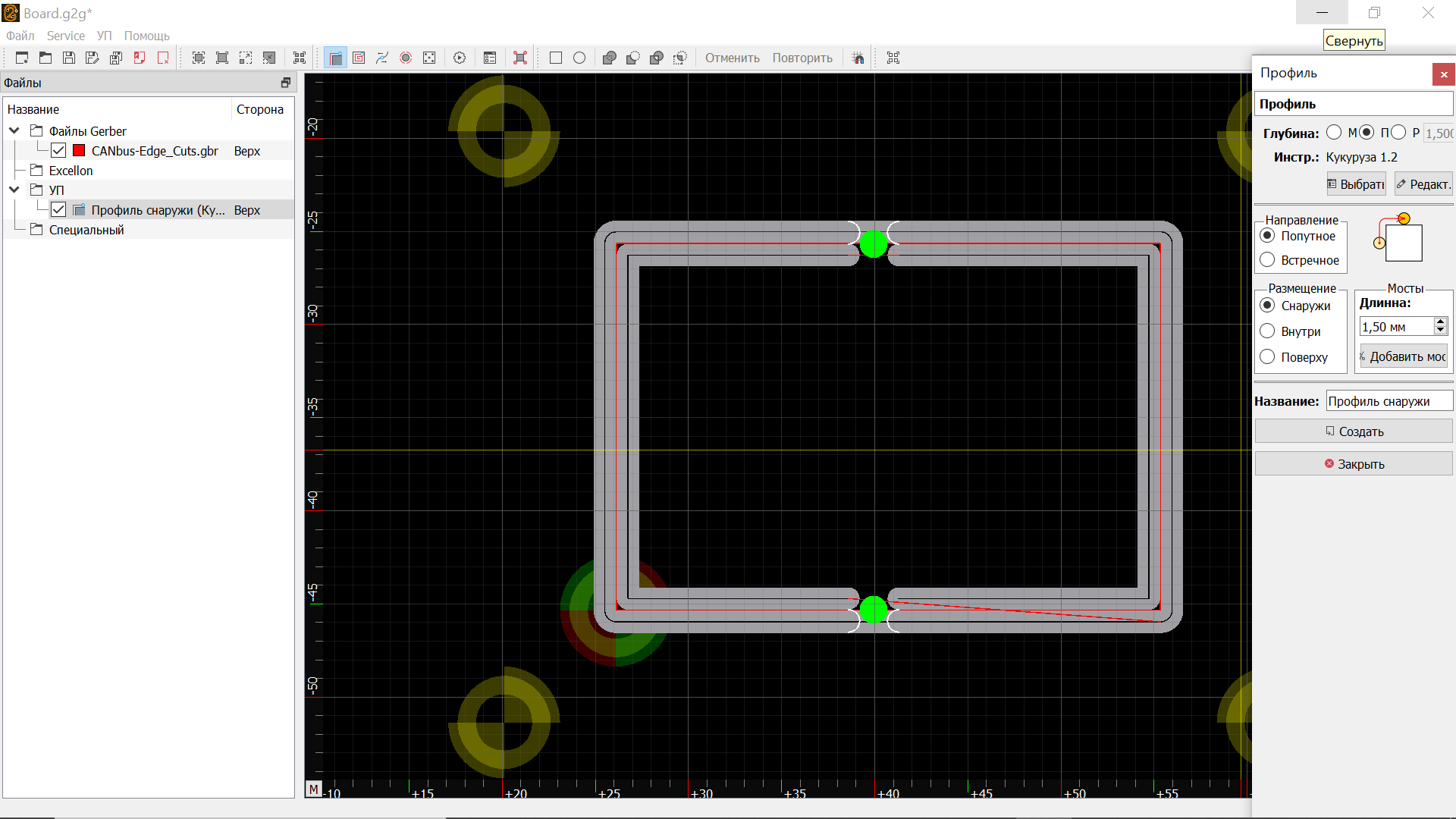 Тогда тут вероятно где-то есть (либо был совместно с двойным обходом контура обрезки) глючок. Потому что я пытался обрезать плату 50х85 фрезами диаметром 2,5 и 1 мм. Возможно, эти фрезы как раз и не пролазили между двумя контурами обрезки. Ну ладно, помучаю пока новую версию. В ней вроде пока такого не возникало.X-Ray писал(а):Это например когда диаметр фрезы больше диаметра фрезеруемого отверстия или ширины прямоугольника.