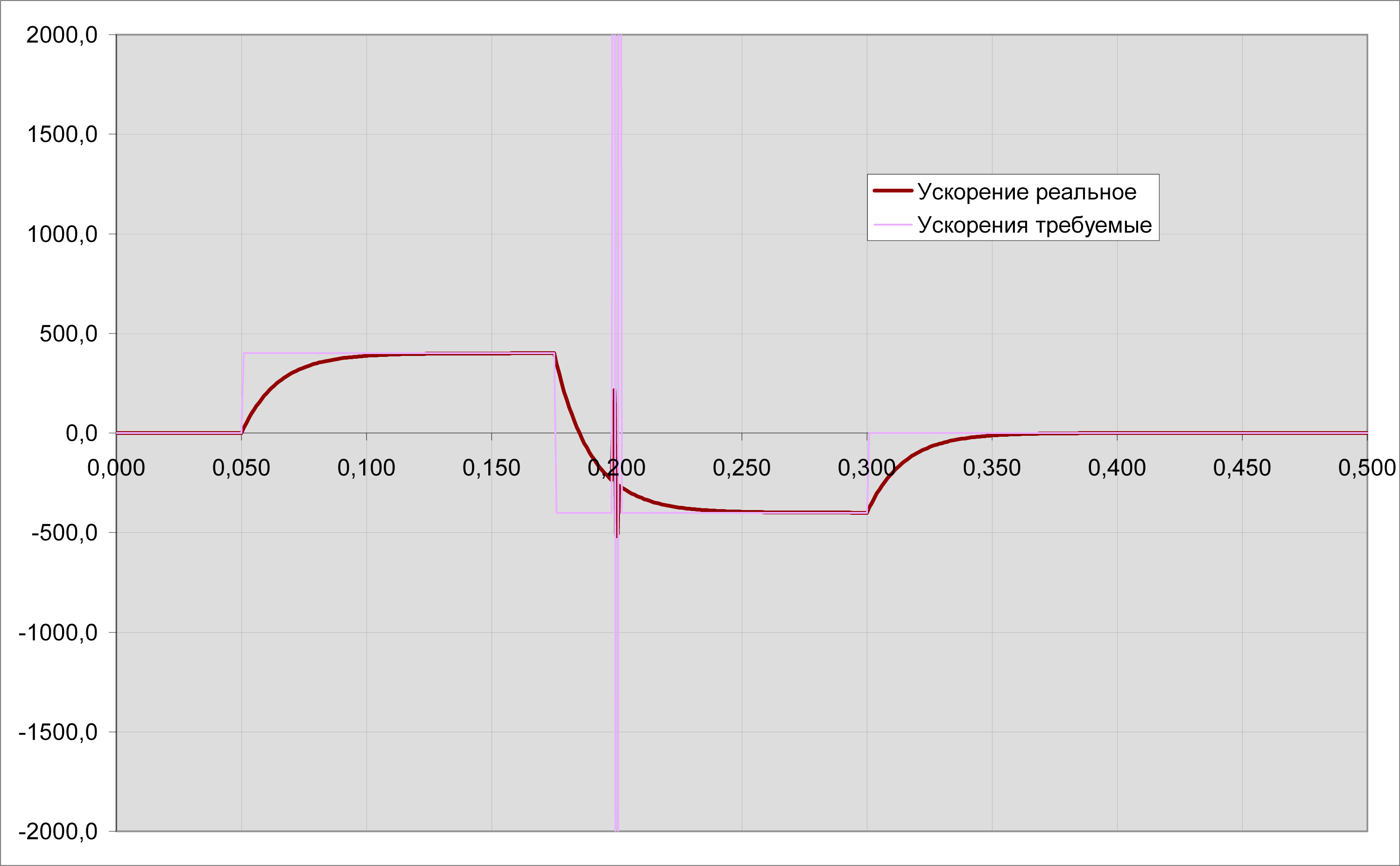 На графиках ускорение 400 мм/сек2 (до 1000 мм/сек2 картина почти не меняется, лишь отклонение от угла увеличивается пропорционально увеличению ускорения), количество шагов на миллиметр на результат не влияет.