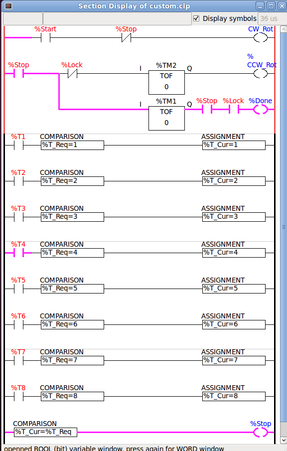 Так ты можешь ставить вместо простого вывода типа --( )--, вывод с запоминанием значения --(S)--, и тогда таймер будет не нужен. А перед стартом процедуры скидывать значение при помощи --(R)--Хммм.. странно, по идее по пину start, он должен "мигнуть" CW_Rot и вырубиться. Или у тебя еще где-то цикл спрятан?
