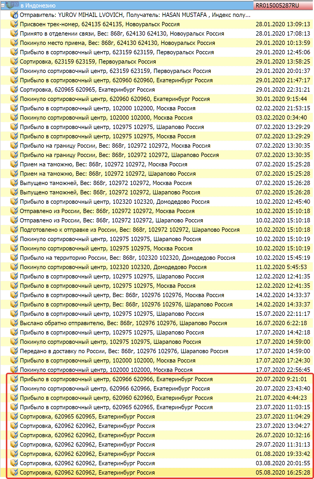 А Почта России - вообще красавчики. Посылку в Индонезию доставляют уже 192 дня. Отправил еще одну — 109 дней прошло, но из Москвы так и не уехала.