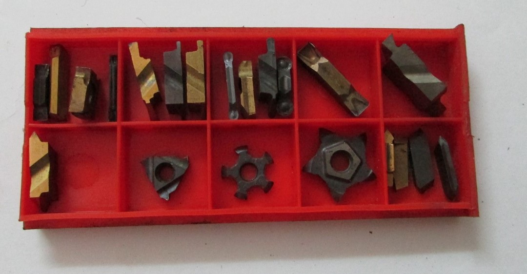 В коробульке собраны образцы чтобы знать что вообще есть на складе. Есть канавочные сферические, канавочные узкие 0,5мм. есть резьбовые резьбу которую никогда не видел .... Резьбовые как отрезные. По маркировке похоже на Iskar https://www.iscar.com/eCatalog/item.asp ... P=M&isoD=1 . В китайские отрезные не все залезет, нужно доработать напильником.